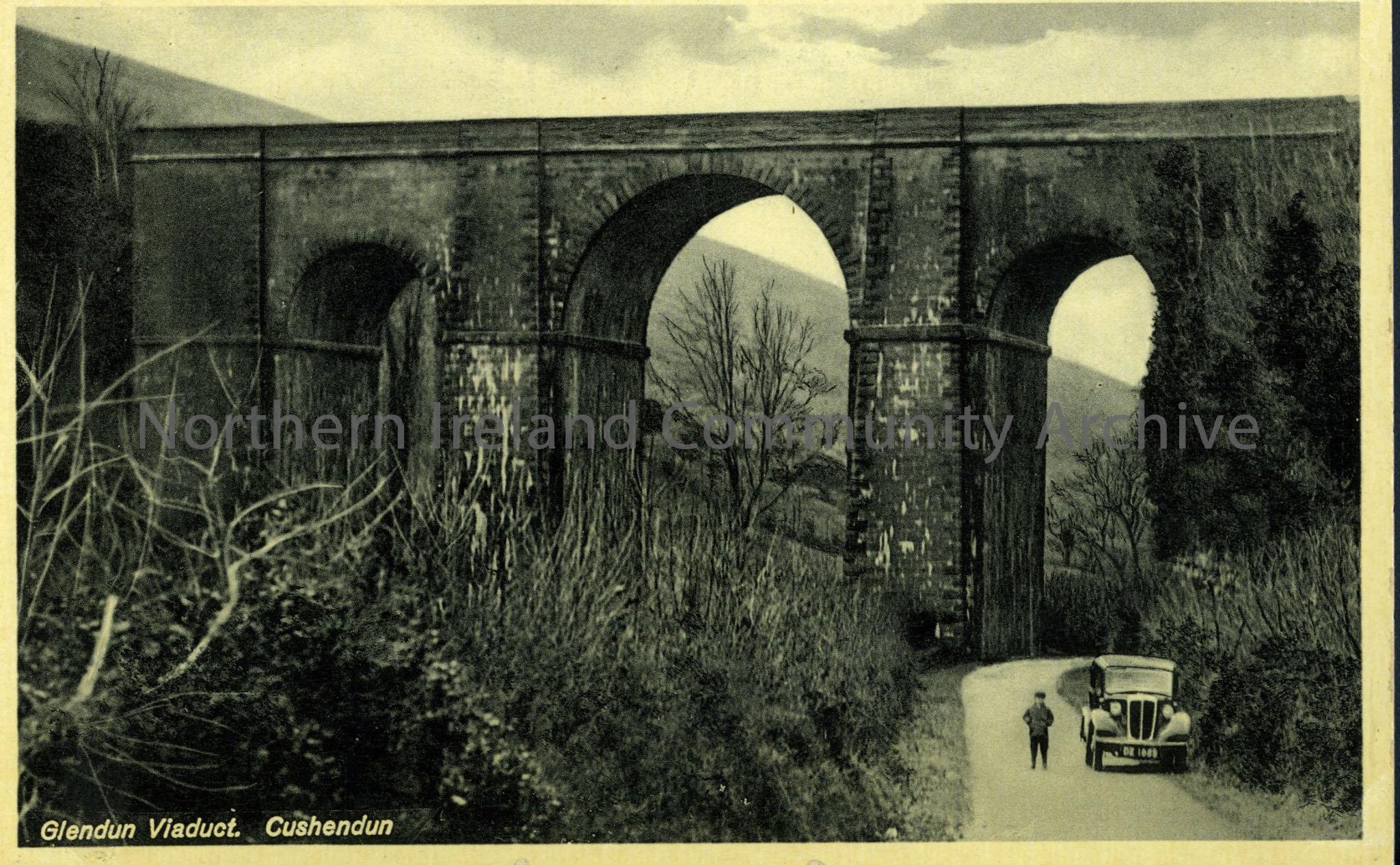 Postcard depicting Glendun Viaduct Cushendun with small boy and motorcar under it.