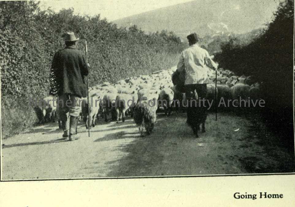 Going Home - cutting from journal article or magazine - photograph of 2 shepherds, with crooks, and sheep