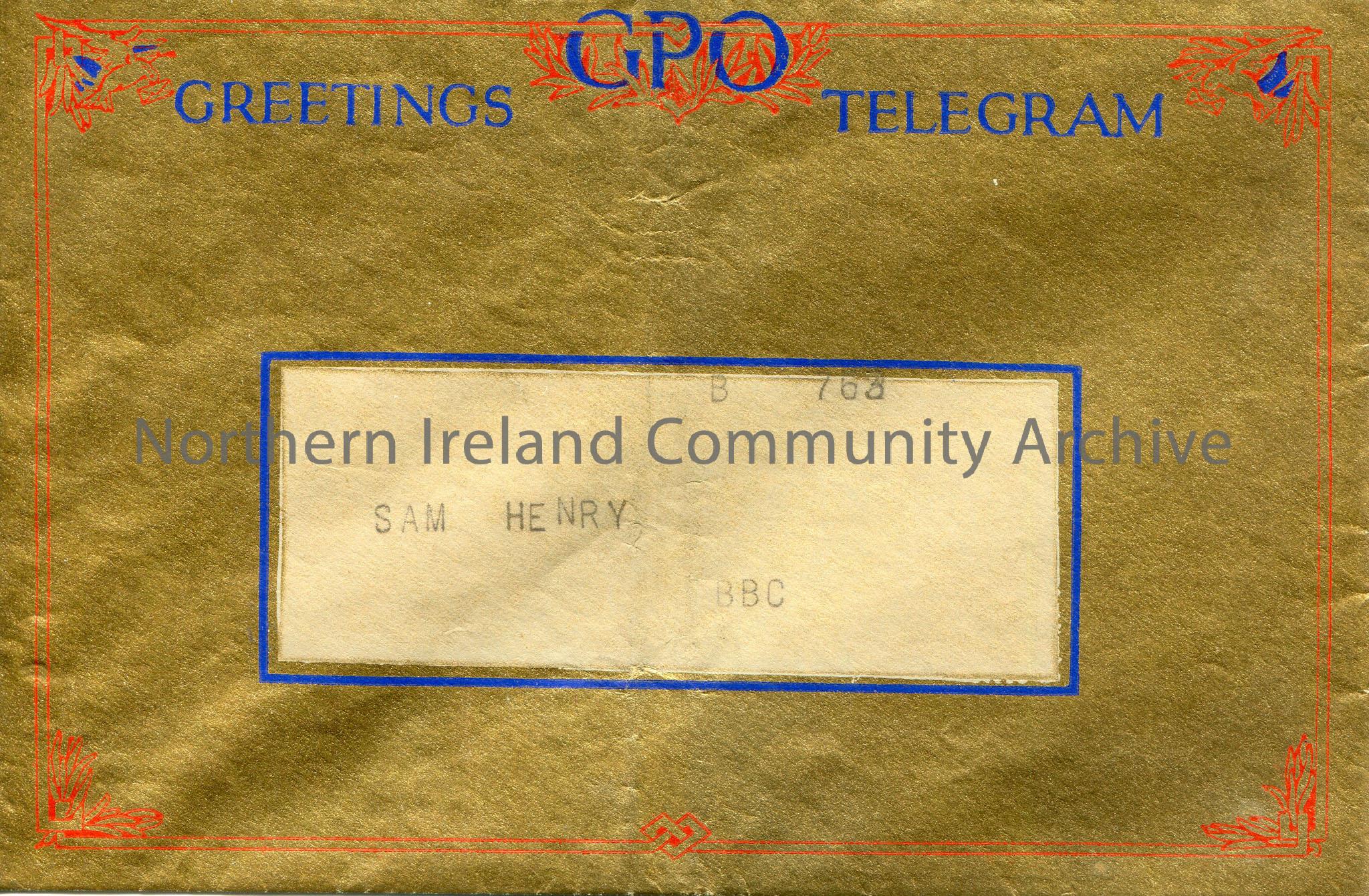 Gold envelope with ‘Greetings Telegram, GPO’ in blue lettering on front to Sam Henry, BBC, B763. Red border.