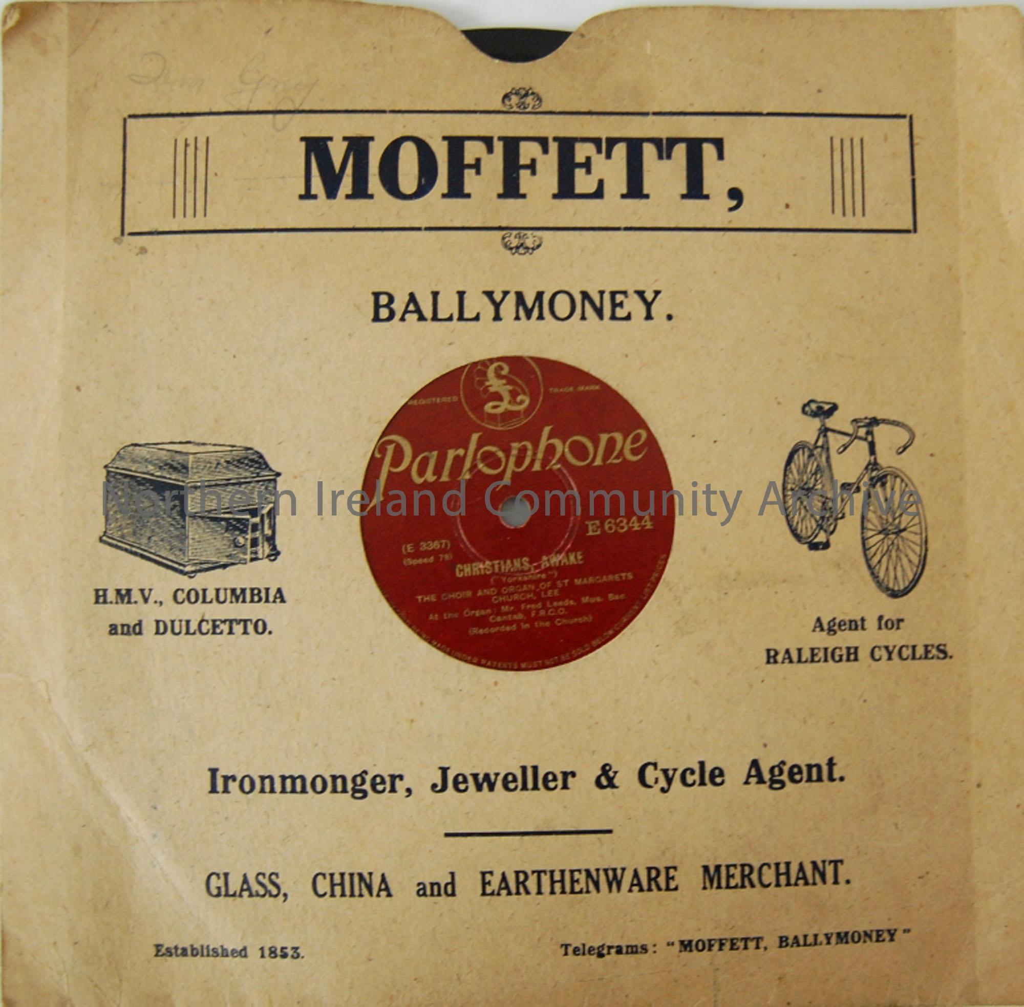 Gramaphone record and sleeve from Moffett's store, Ballymoney