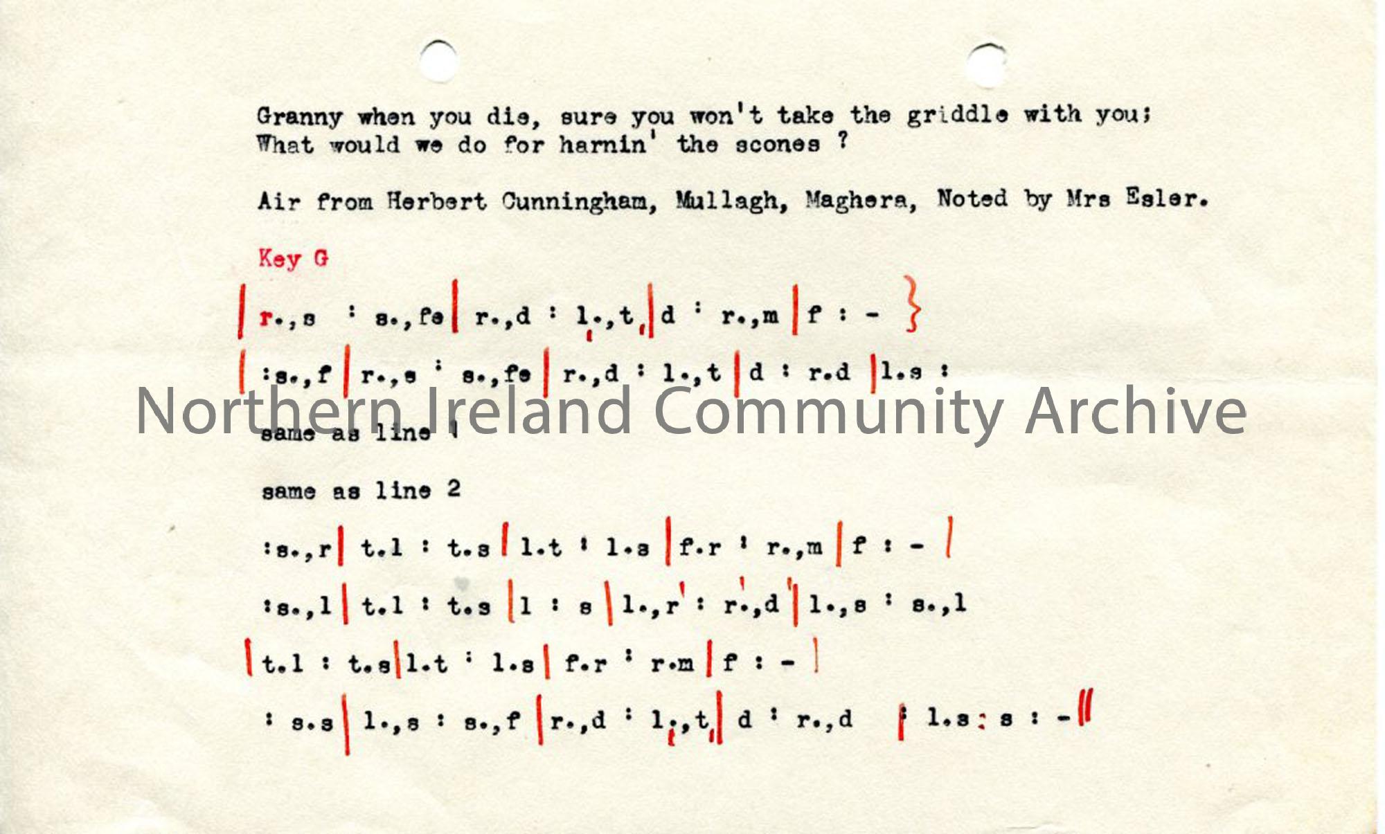 Typed tonic sol-fa notation under heading 'Granny when you die, sure you won't take the griddle with you; What would we do for harnin' the scones'