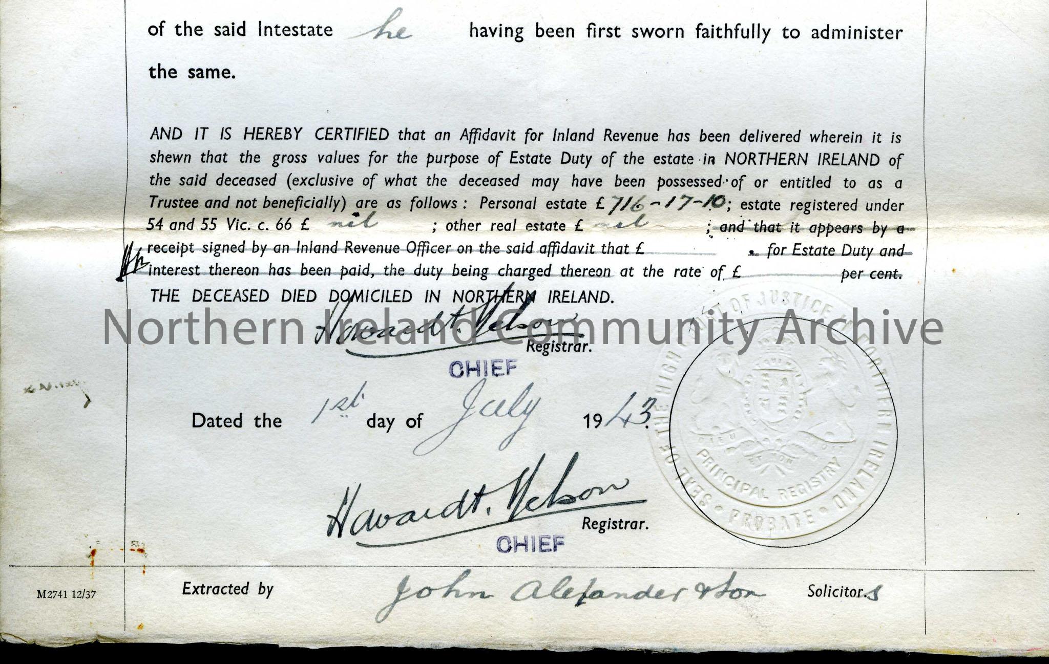 Grant of Administration of the estate of Wm. Jas McCrory - deceased. Folded into four.