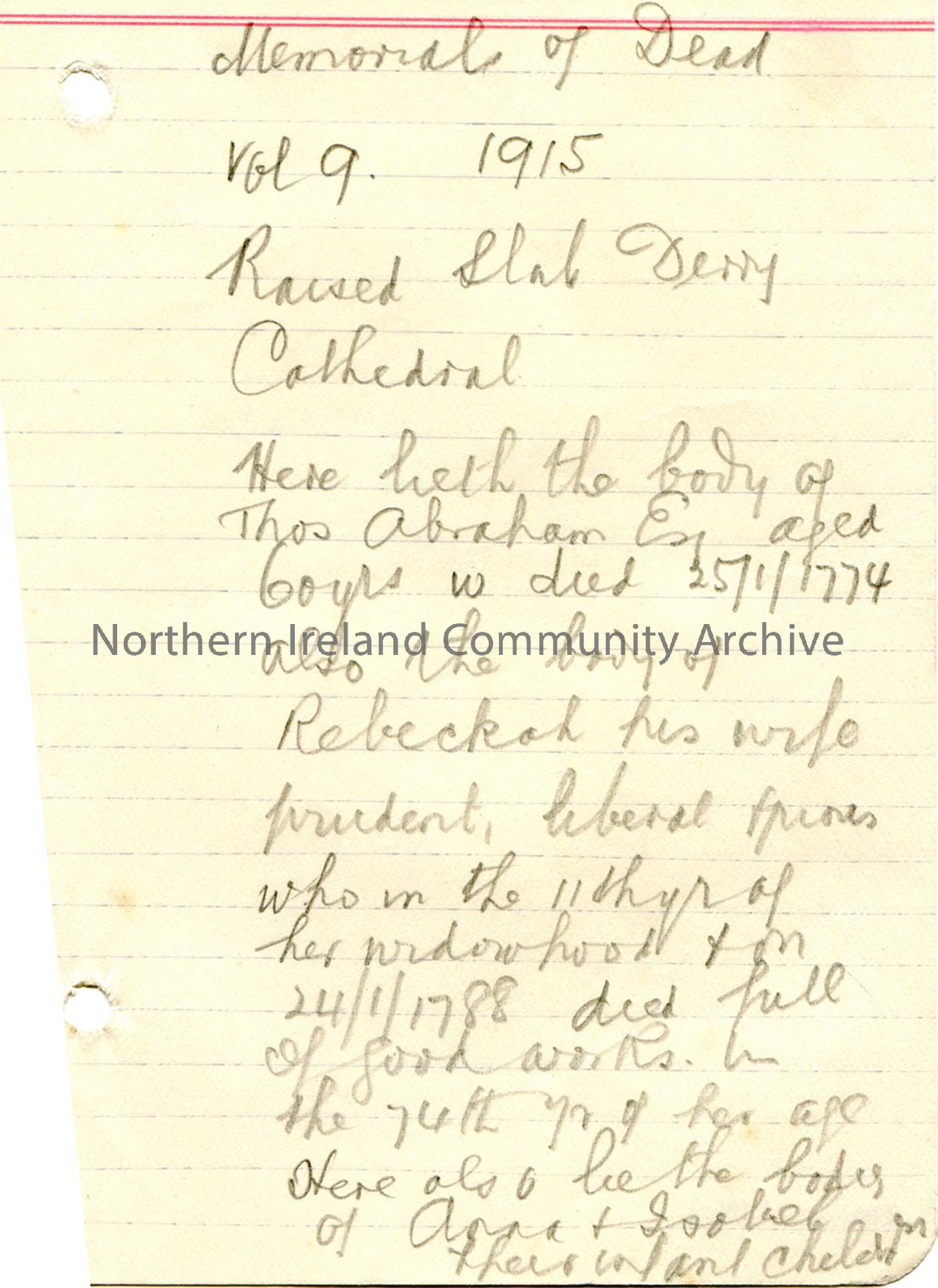 Handwritten note in pencil on lined page from Memorials of Dead, Vol. 9, 1915 re inscription of raised slab at Derry Cathedral of Thomas Abraham.