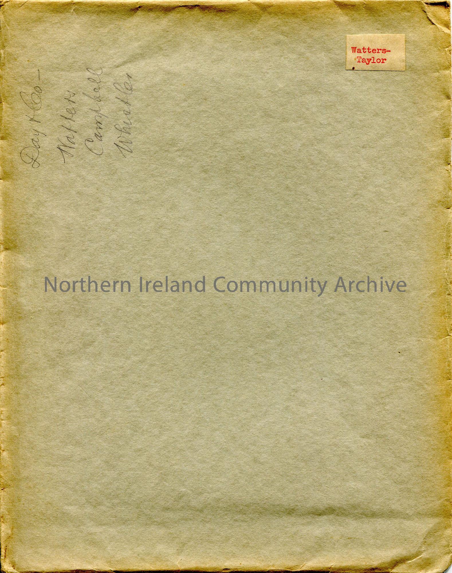 Green folder, doubly labelled:- ‘Watters-Taylor’ in small red print typed label; ‘Day & Co – Watters, Campbell, Whistler’.