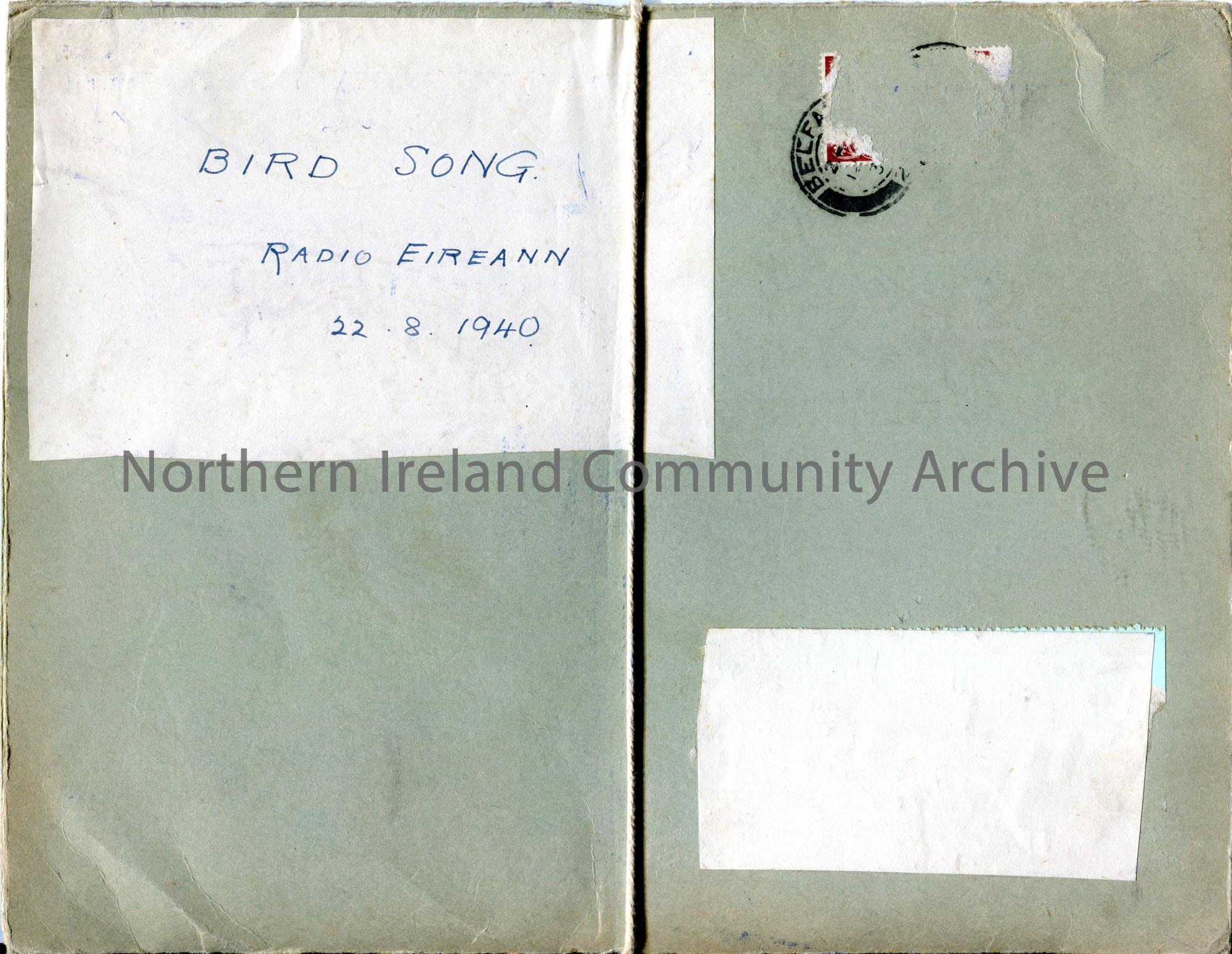 Green folder fastened with string and labelled, ‘Bird Song. Radio Eireann. 22.8.1940’. Remnants of postage stamp on front of folder.