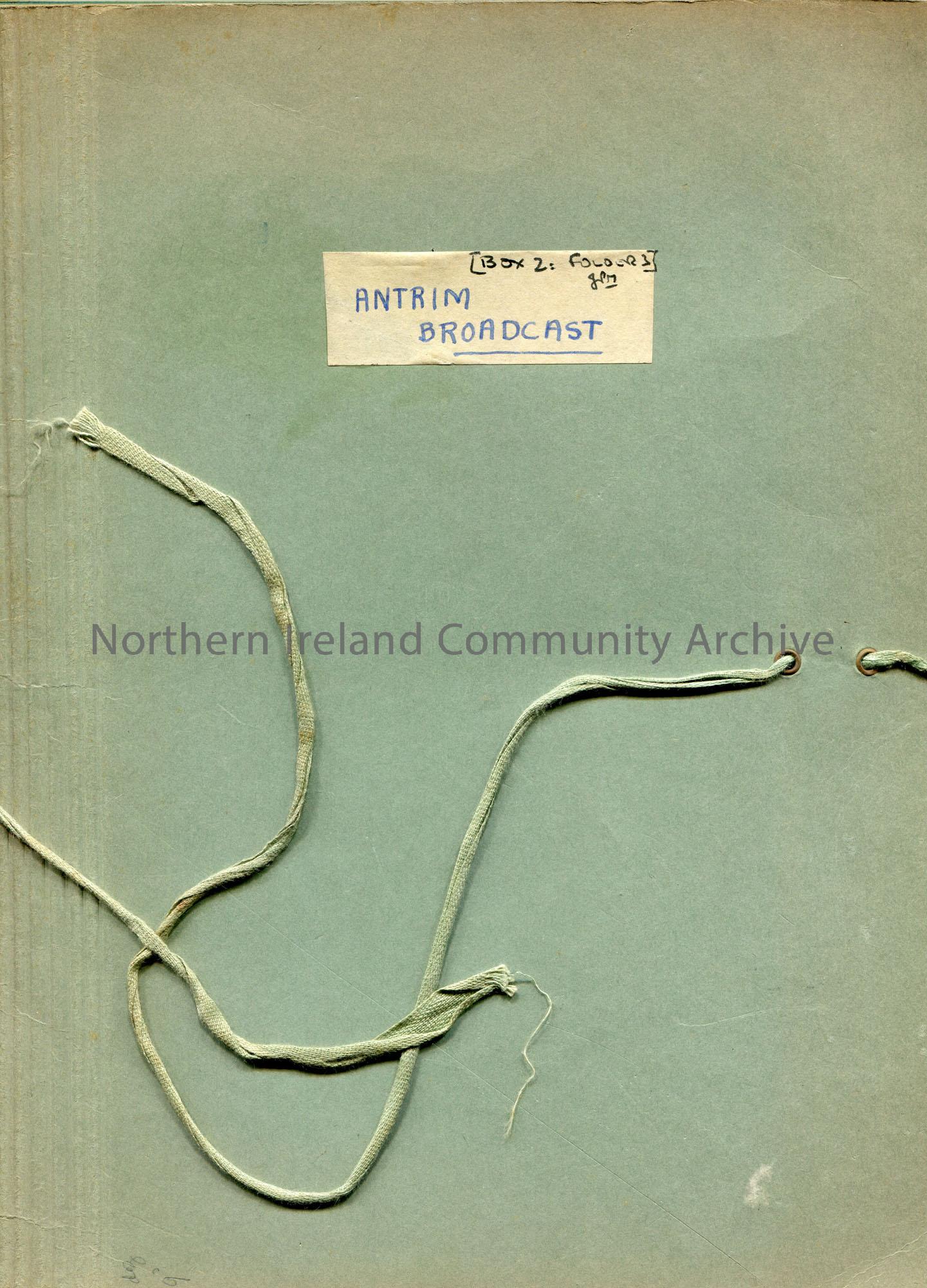 Green folder labelled ‘Antrim Broadcast’ in blue ink. Also labelled ‘Box 2: Folder 3. JM’ in black ink. ‘Miscellaneous’ written in pencil but erased o…