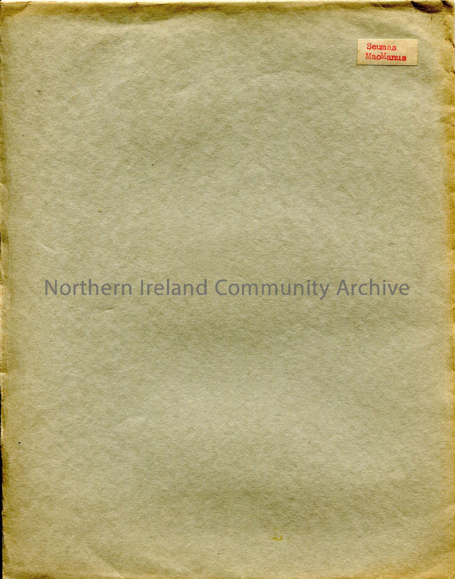 Green folder labelled ‘Seumas MacManus’ – misspelling of Seamus MacManus