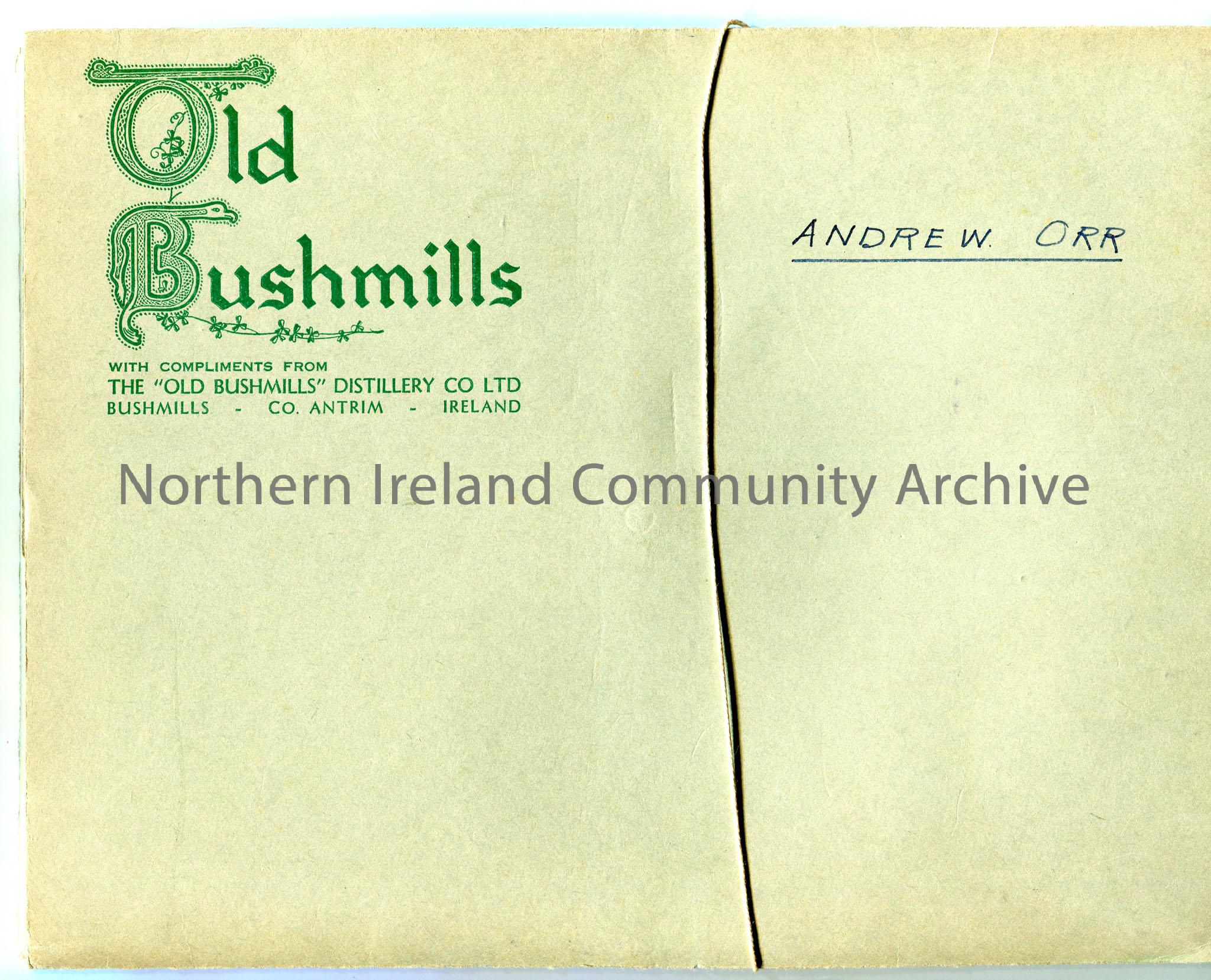 Green folder labelled with Bushmills Distillery logo and handwritten ‘Andrew Orr’.