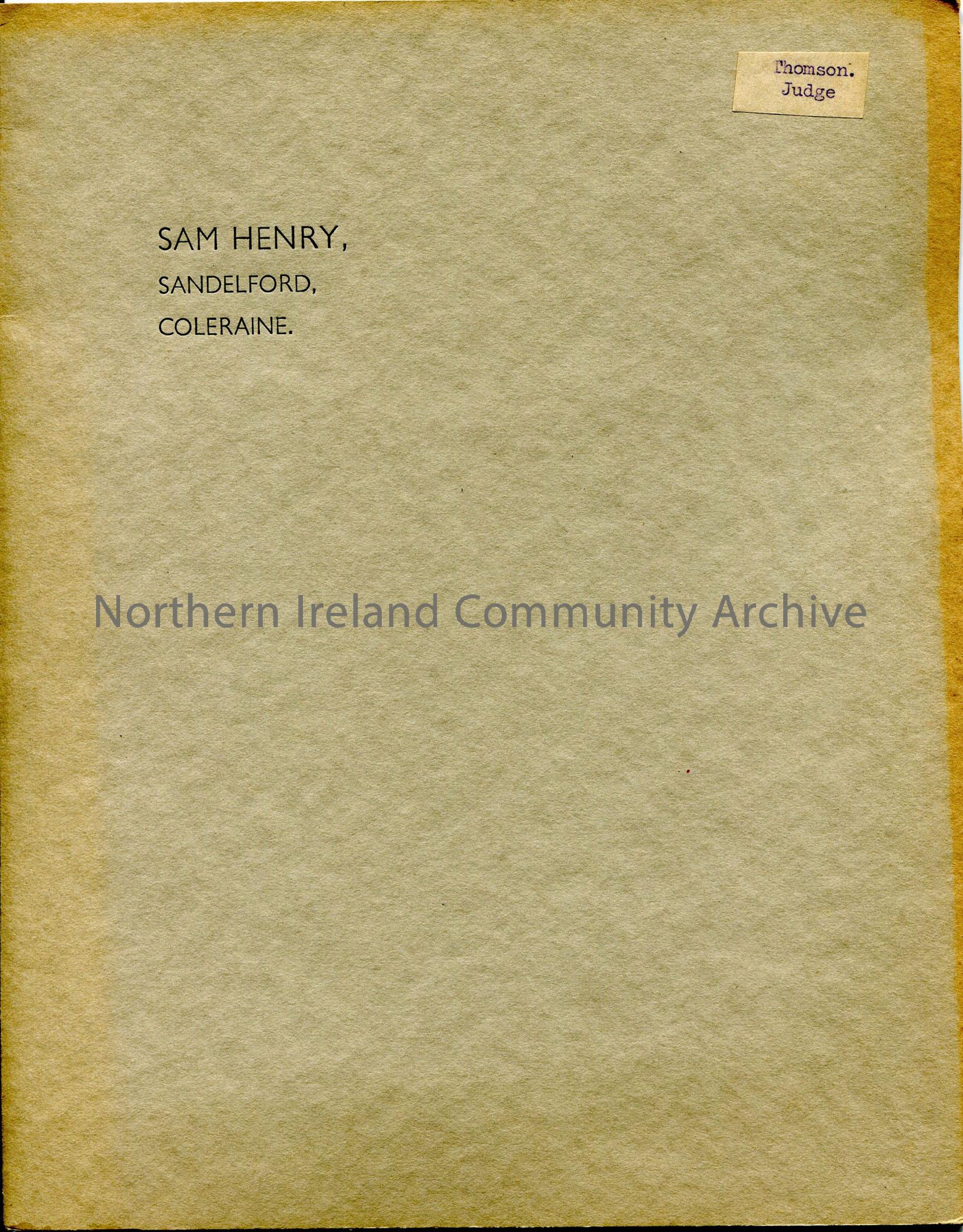 Green folder stamped with Sam Henry’s name and address and labelled ‘Thomson. Judge’