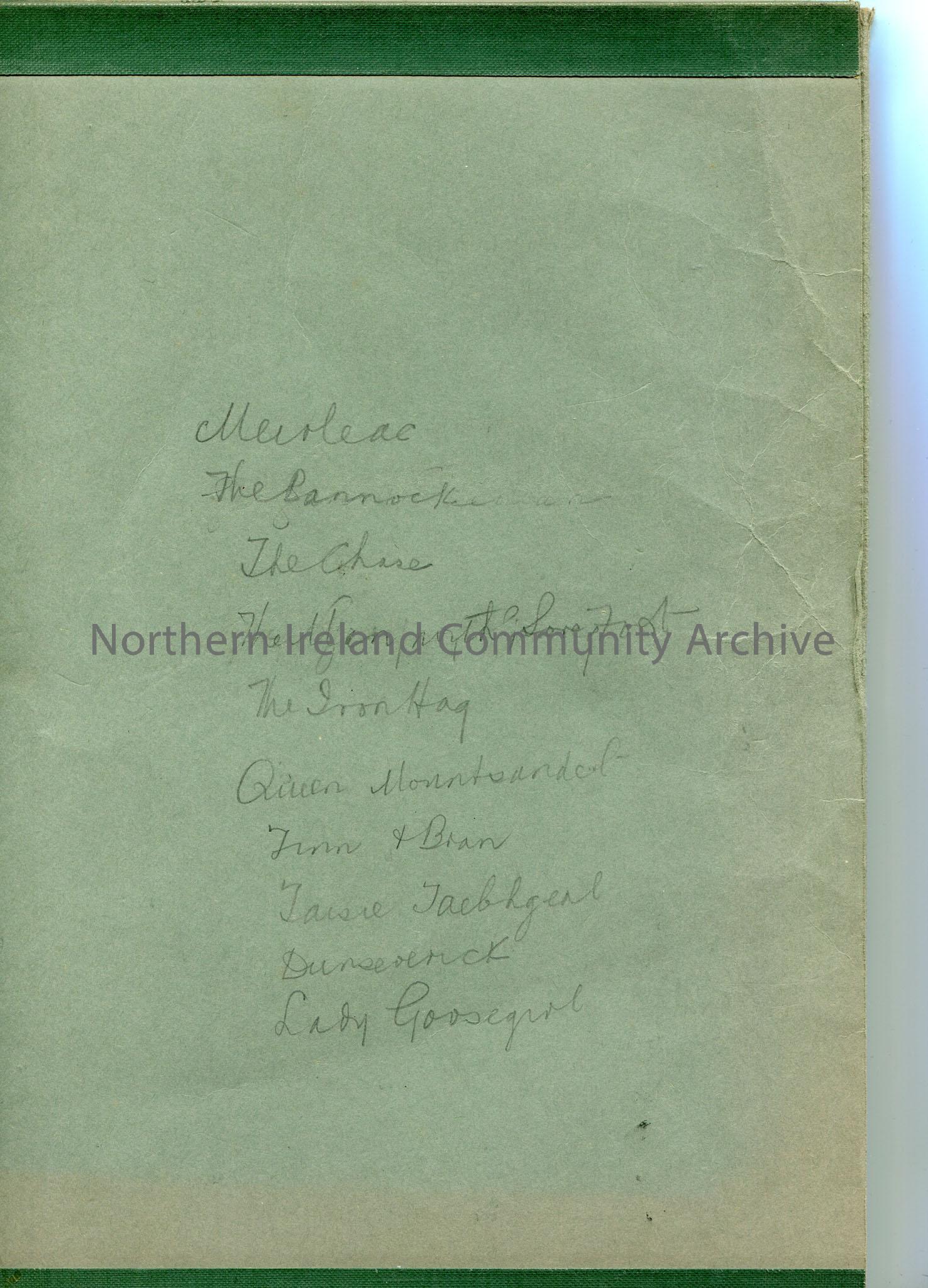 Green folder which opens up and is labelled 'Athlone Broadcasts. June 27th, 1939 at 8 O'c. Rathlin Tale, July 11th, 7:30-7:45...Do, July 12th, 7:30-8 O'c... Songs of North.' 'C7389' handwritten in pencil upside down on label. Handwritten list on inside cover, mentions Dunseverick and Mountsandel - possibly list of stories.