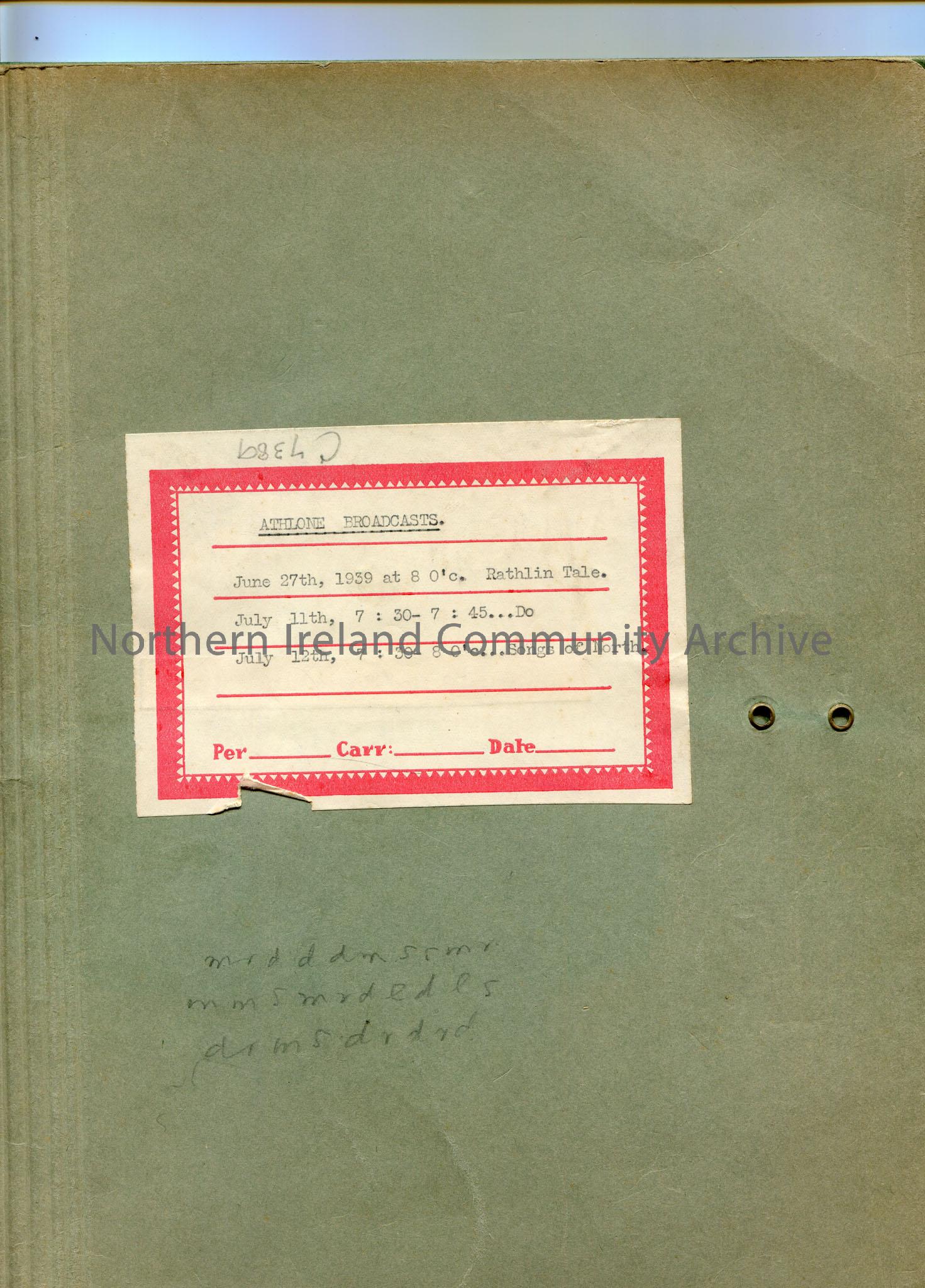 Green folder which opens up and is labelled 'Athlone Broadcasts. June 27th, 1939 at 8 O'c. Rathlin Tale, July 11th, 7:30-7:45...Do, July 12th, 7:30-8 O'c... Songs of North.' 'C7389' handwritten in pencil upside down on label. Handwritten list on inside cover, mentions Dunseverick and Mountsandel - possibly list of stories.