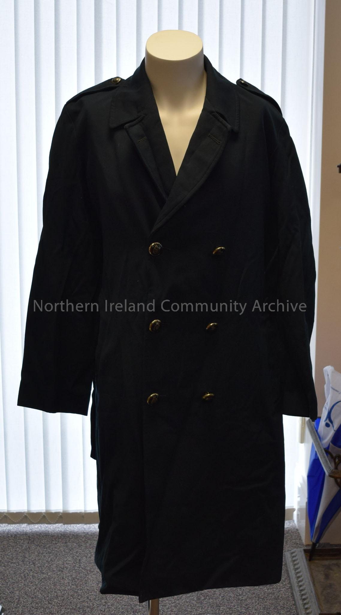 Green heavy double breasted Royal Ulster Constabulary coat with three black and silver buttons with a harp and crown on them. The same buttons but sma…