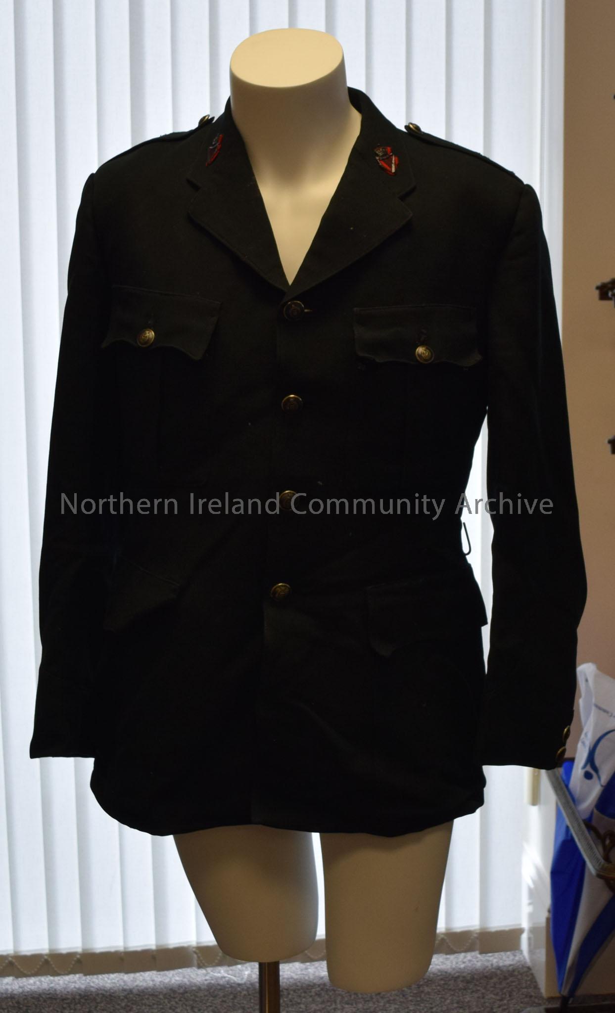 Green heavy Royal Ulster Constabulary jacket with four black and silver buttons with a harp and crown on them down the front, two pockets, and a crown and a shamrock rank insignia on a red background on one shoulder and a harp on a red background on both lapels.