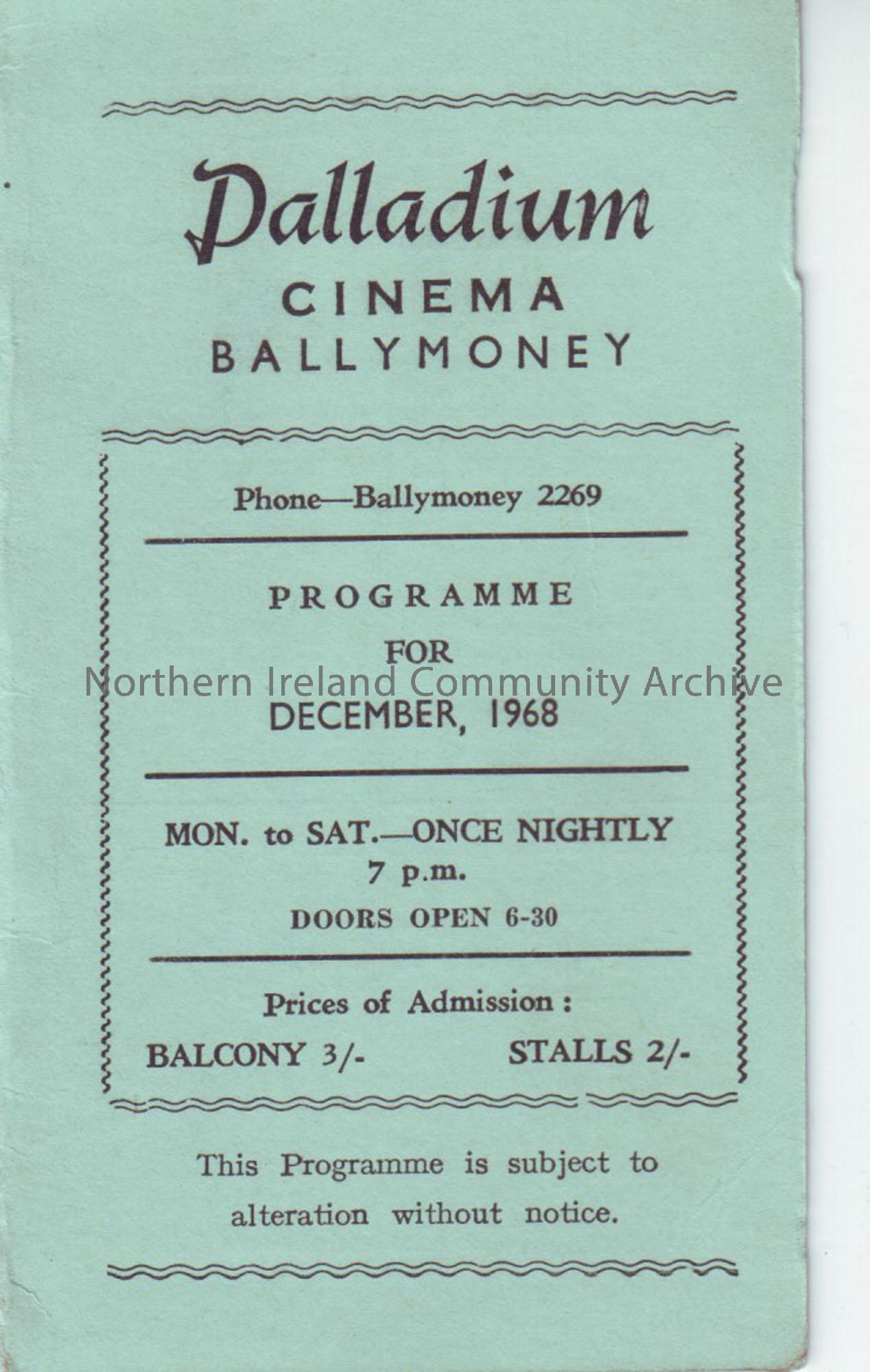 green monthly programme for Ballymoney Palladium cinema- December 1968