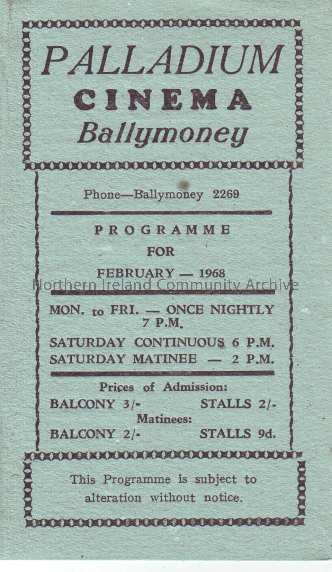 green monthly programme for Ballymoney Palladium cinema- February 1968