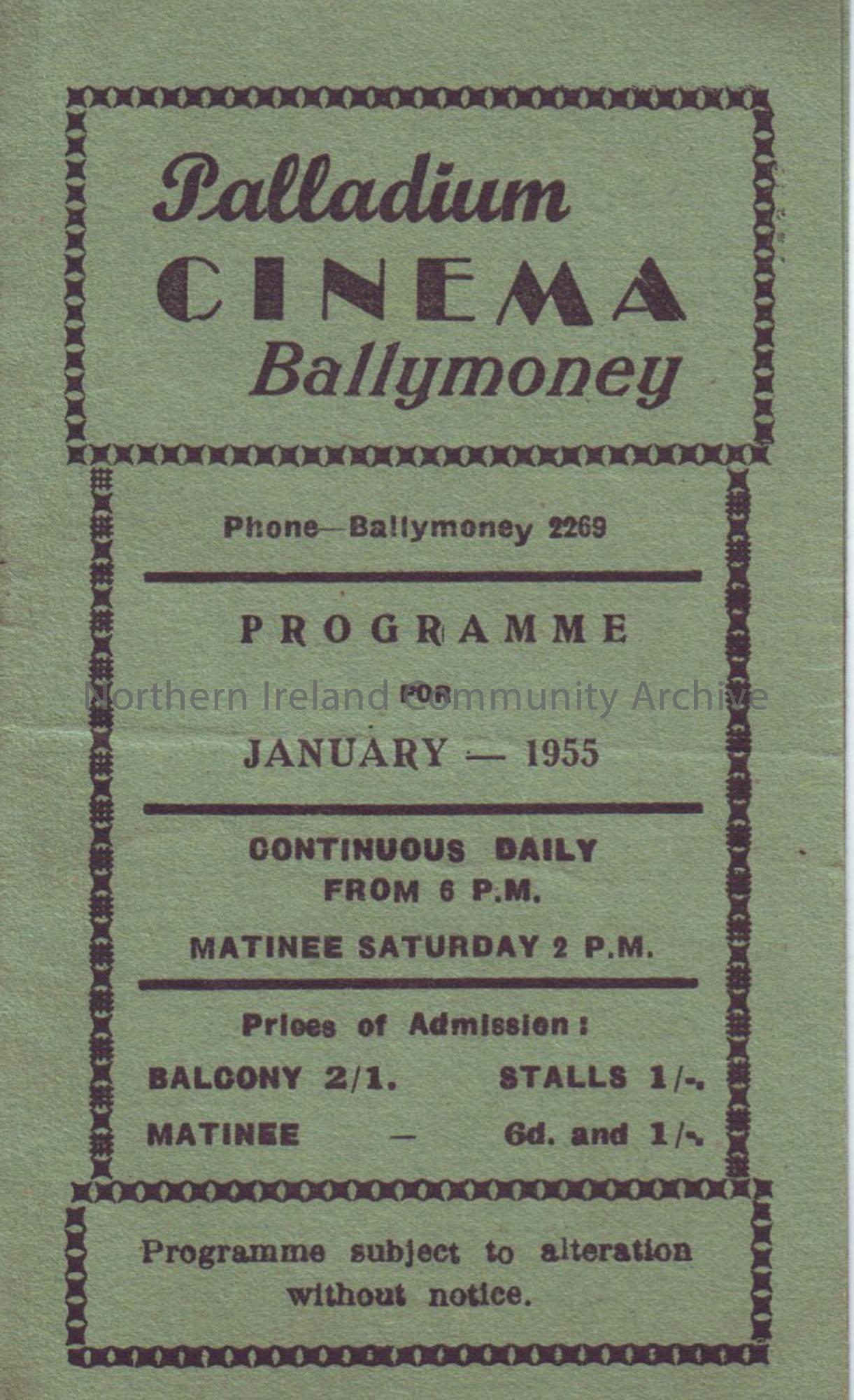 green monthly programme for Ballymoney Palladium cinema- January 1955
