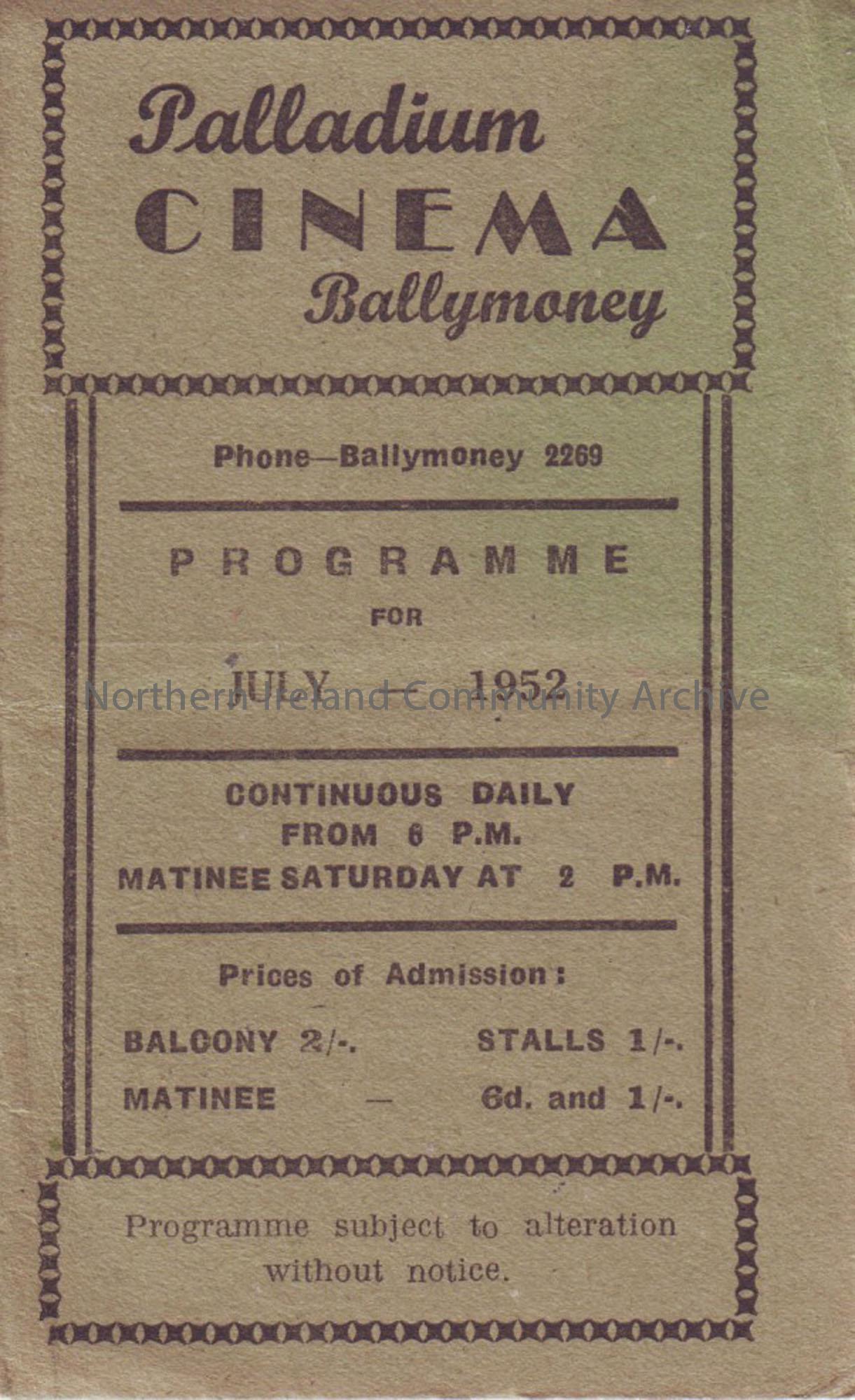 green monthly programme for Ballymoney Palladium cinema- July 1952