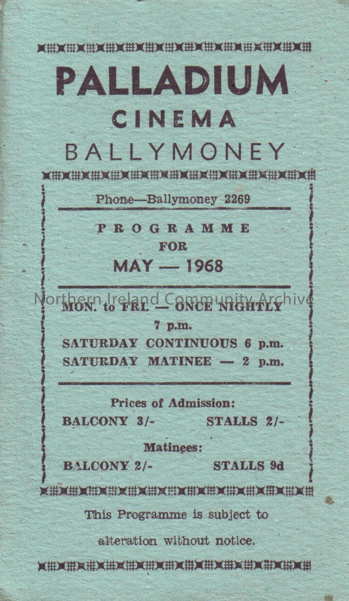 green monthly programme for Ballymoney Palladium cinema- May 1968