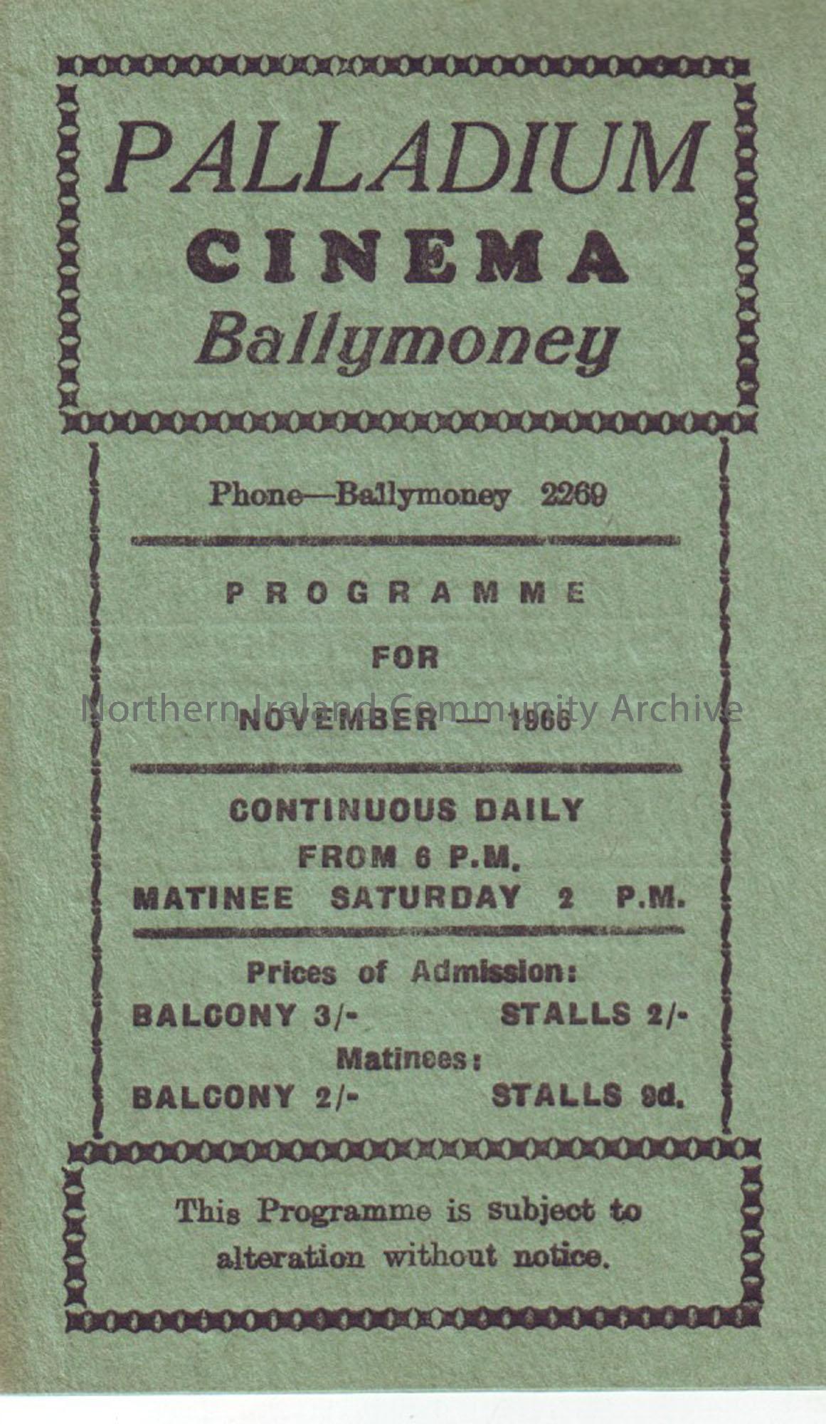 green monthly programme for Ballymoney Palladium cinema- November 1966