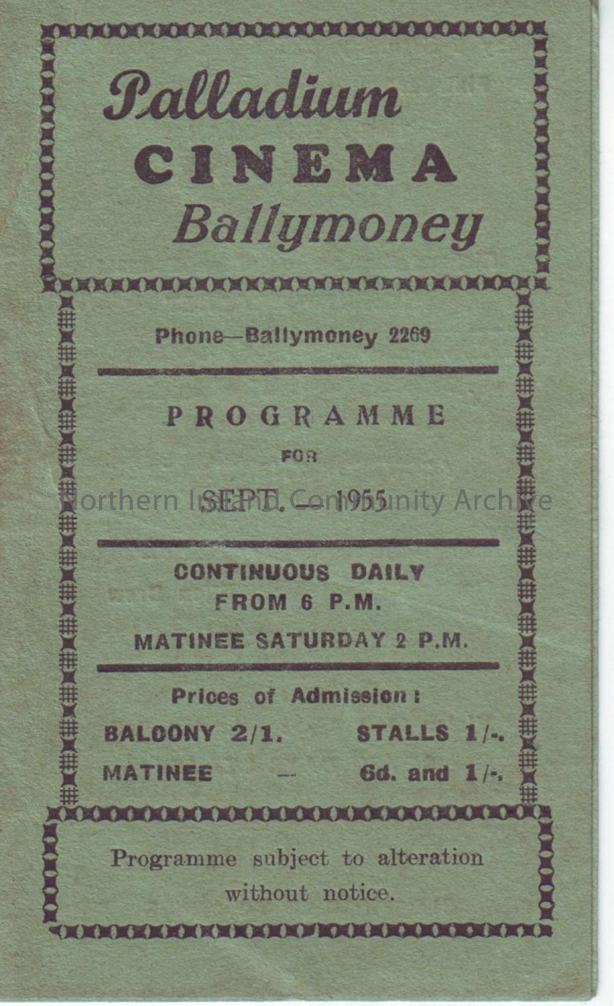 green monthly programme for Ballymoney Palladium cinema- September 1955