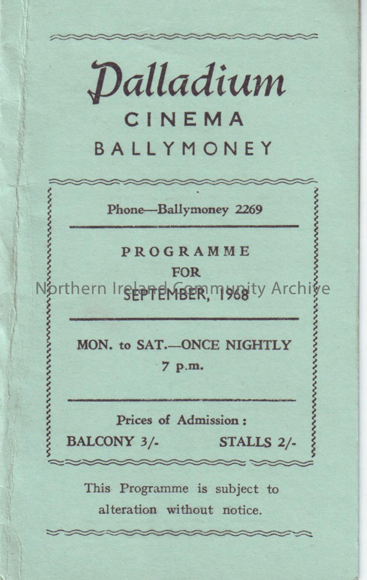 green monthly programme for Ballymoney Palladium cinema- September 1968