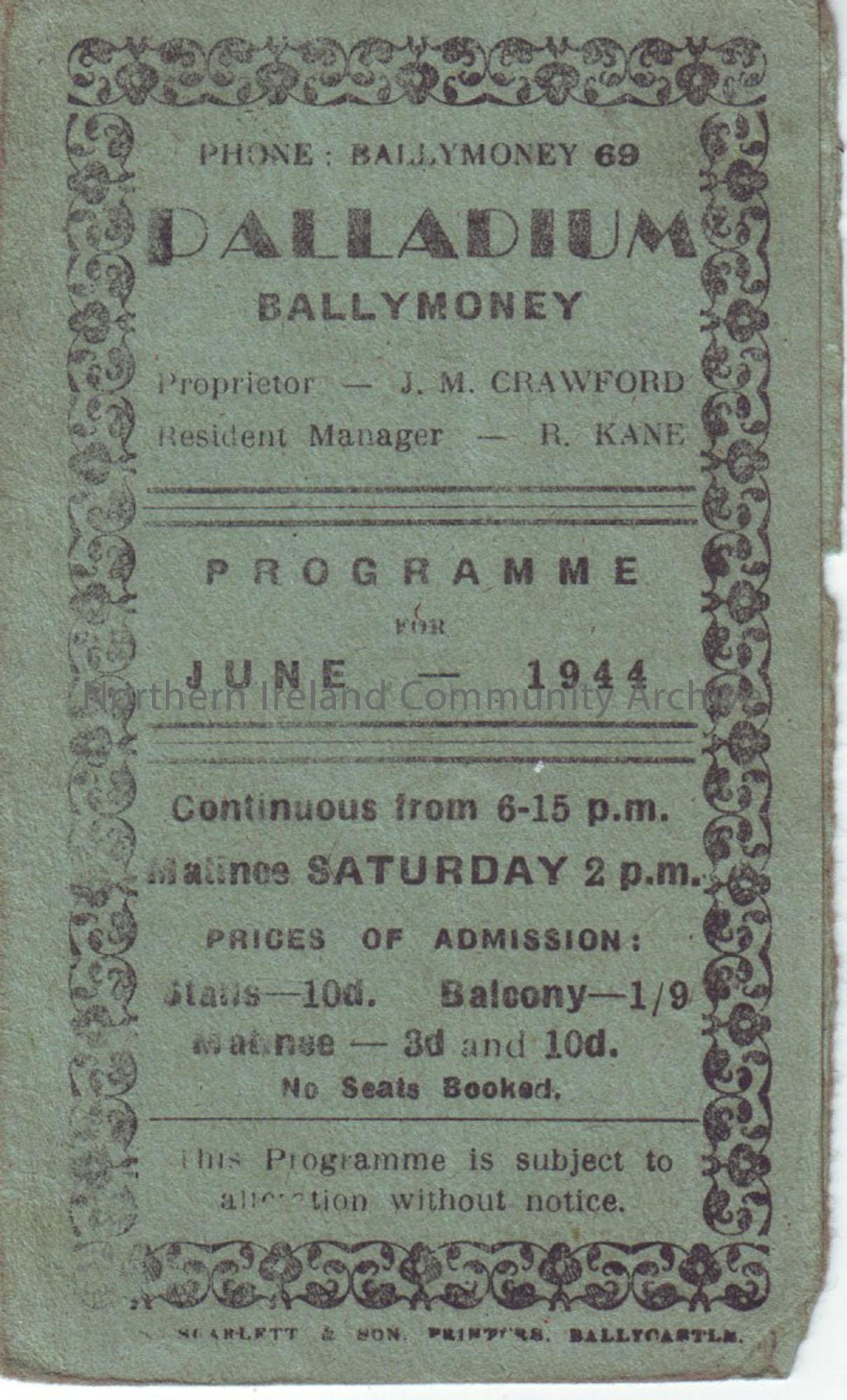green programme for Ballymoney Palladium cinema- June 1944