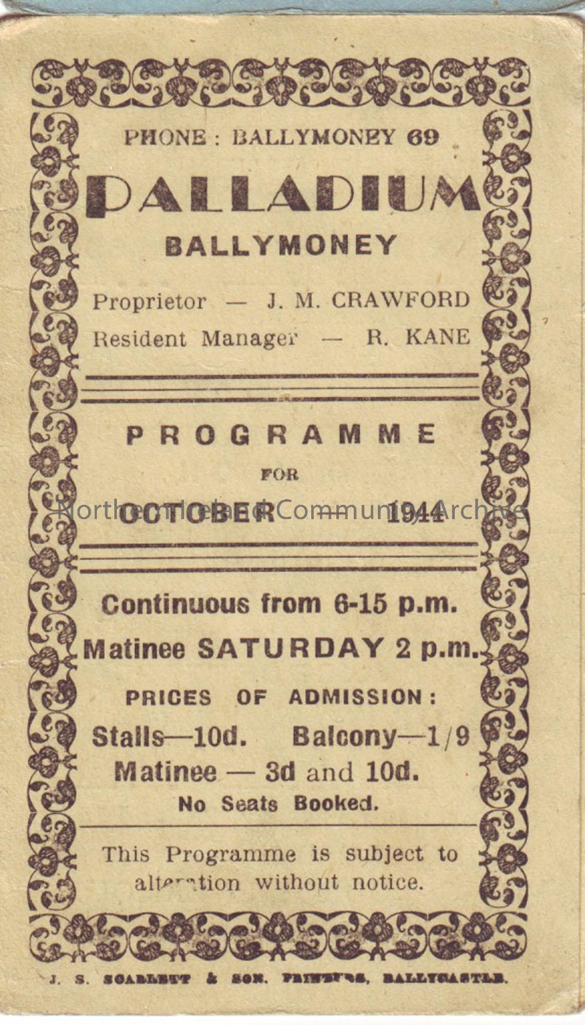 green programme for Ballymoney Palladium cinema- October 1944