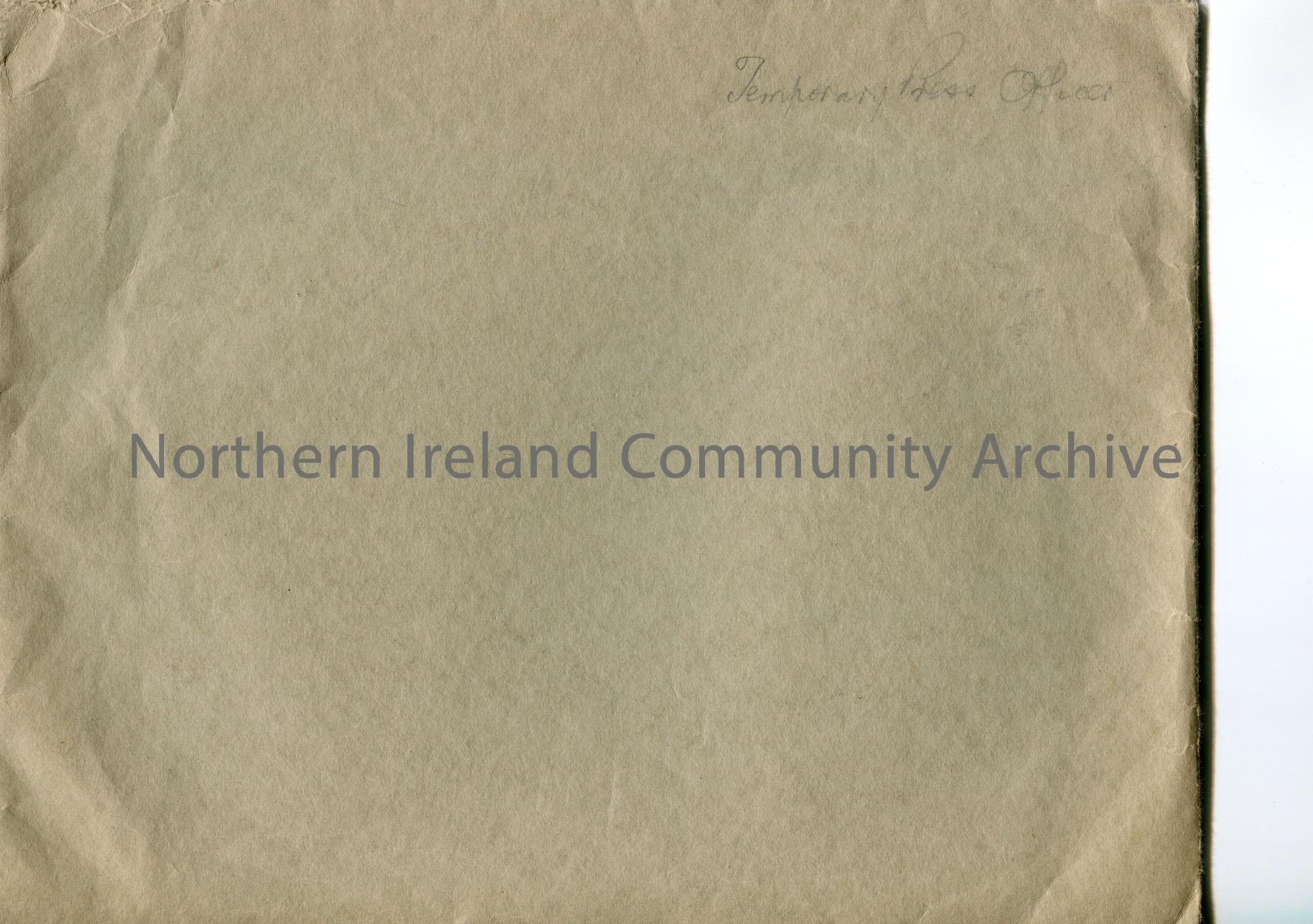 Green/grey coloured envelope named ‘Temporary Press Officer’ written in pencil on front.