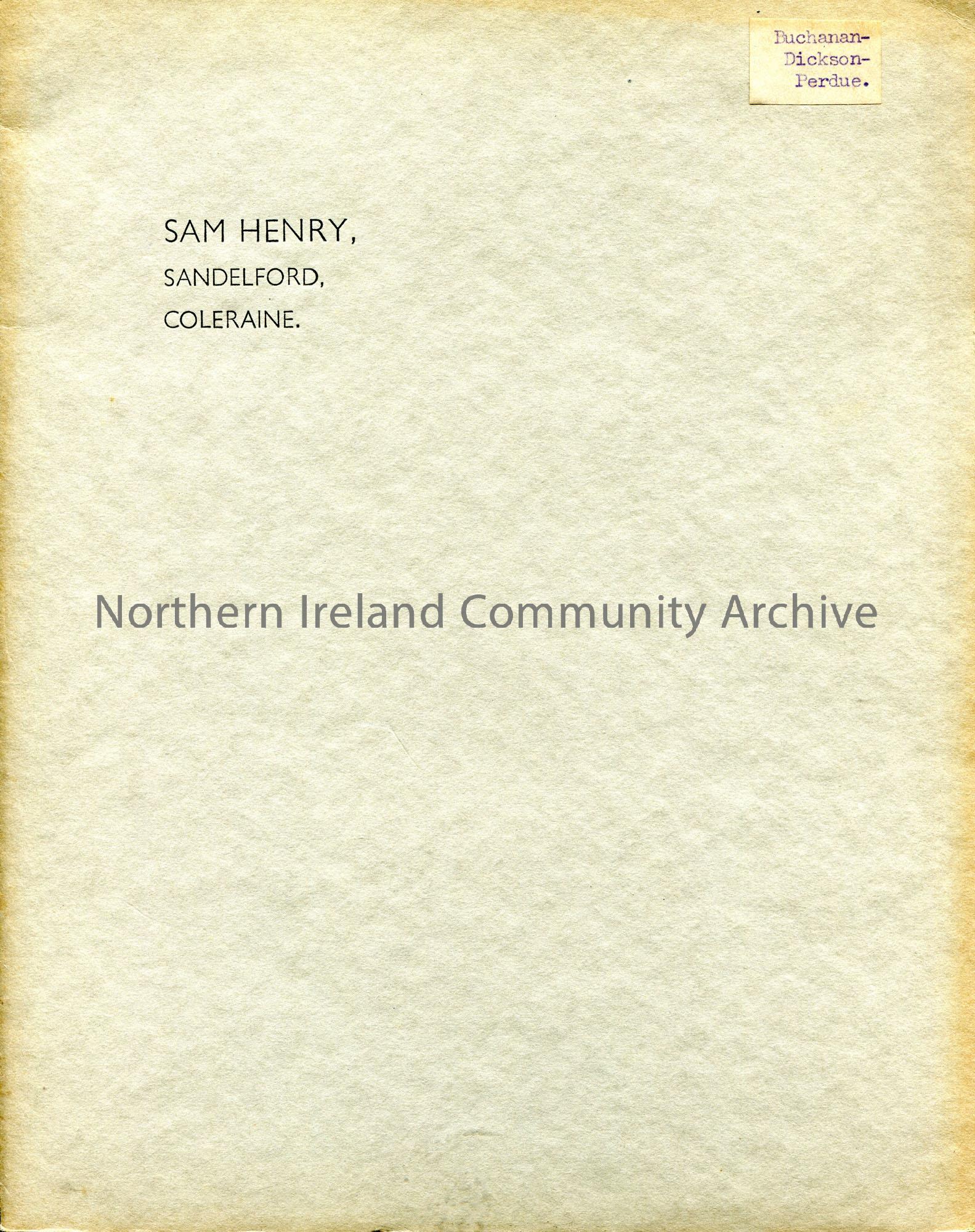 Grey colour folder with inside pocket. Labelled, ‘Buchanan – Dickson – Perdue’. ‘ SAM HENRY, SANDELFORD, COLERAINE ‘ printed on front cover.