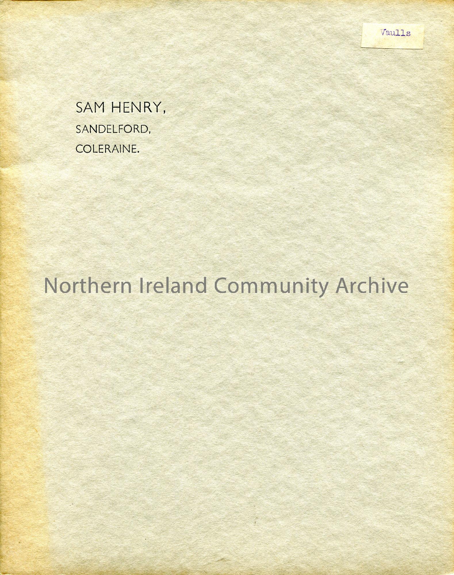 Grey colour folder with inside pocket. Labelled, 'Vaulls'. ' SAM HENRY, SANDELFORD, COLERAINE ' printed on front cover.