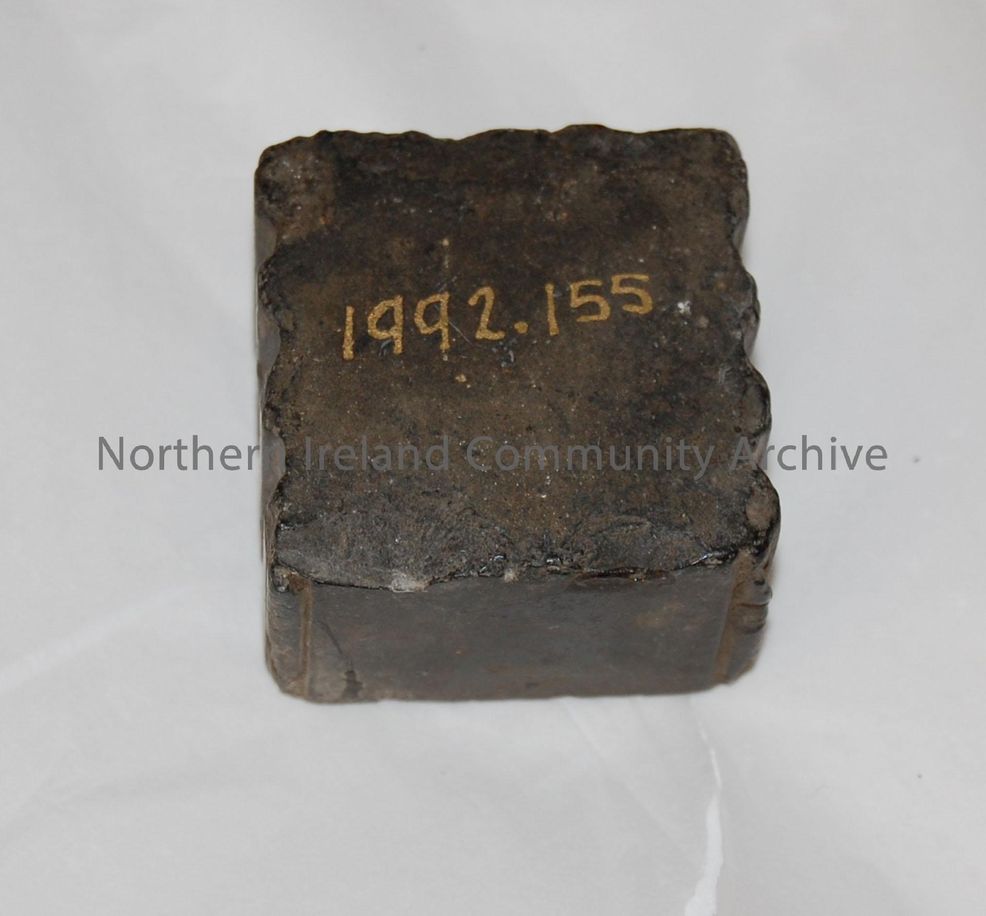 Grey coloured square shaped ink well with side indentations on two faces, the well itself is cylindrical.