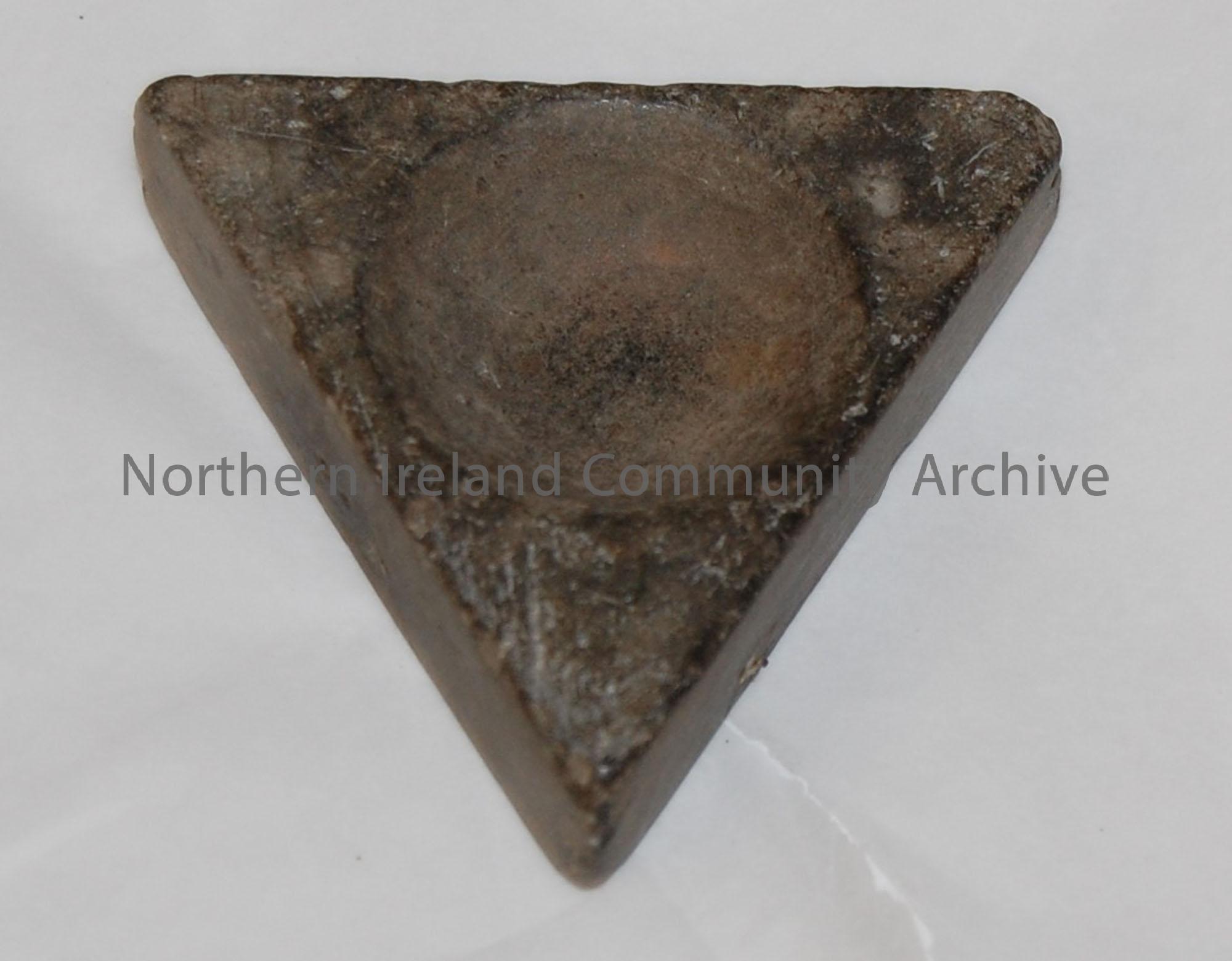 Grey coloured triangular shaped ink well with curved indentation.