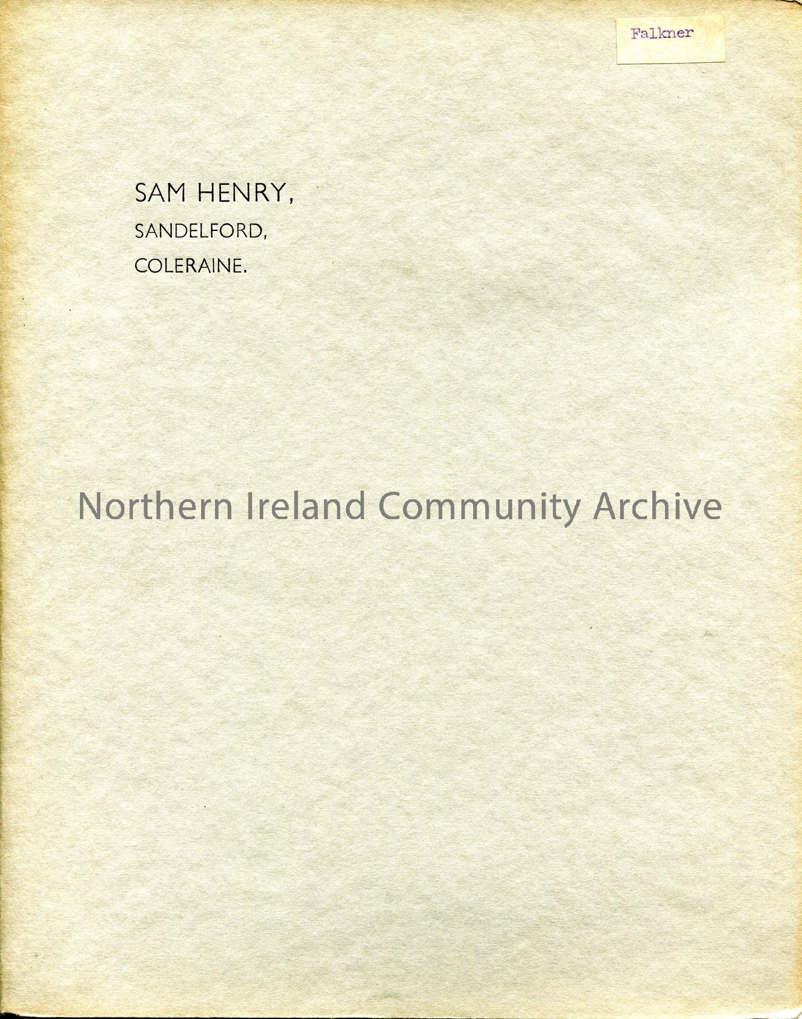 Grey folder with inside pocket labelled ‘Falkner’. ‘ SAM HENRY, SANDELFORD, COLERAINE ‘ printed on front cover.