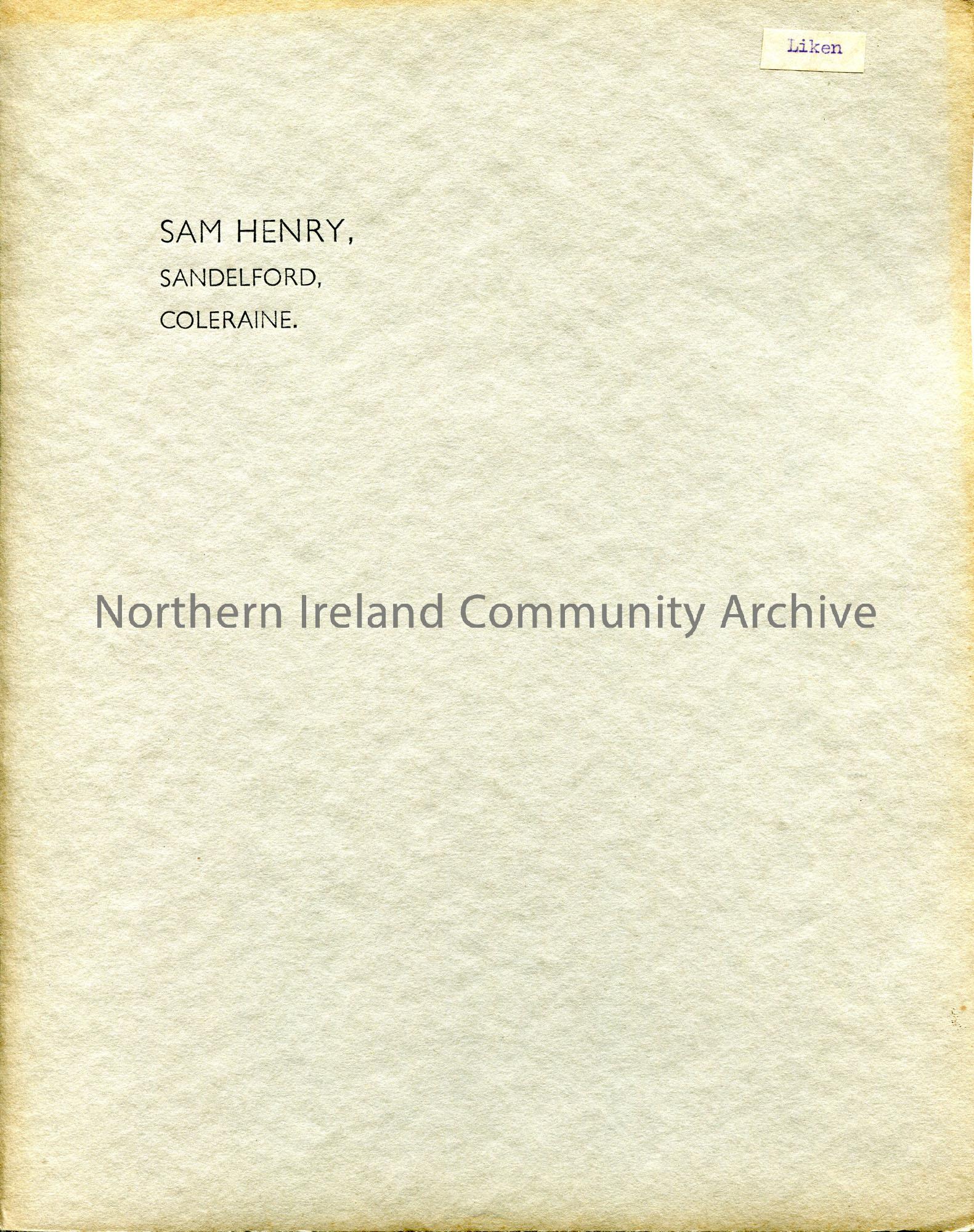 Grey folder with inside pocket labelled 'Liken'. ' SAM HENRY, SANDELFORD, COLERAINE ' printed on front cover.