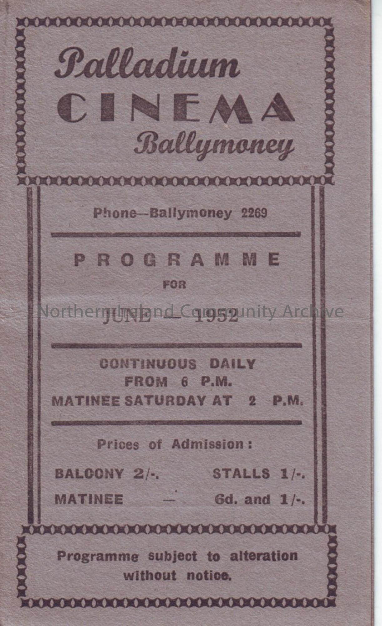 grey monthly programme for Ballymoney Palladium cinema- June 1952