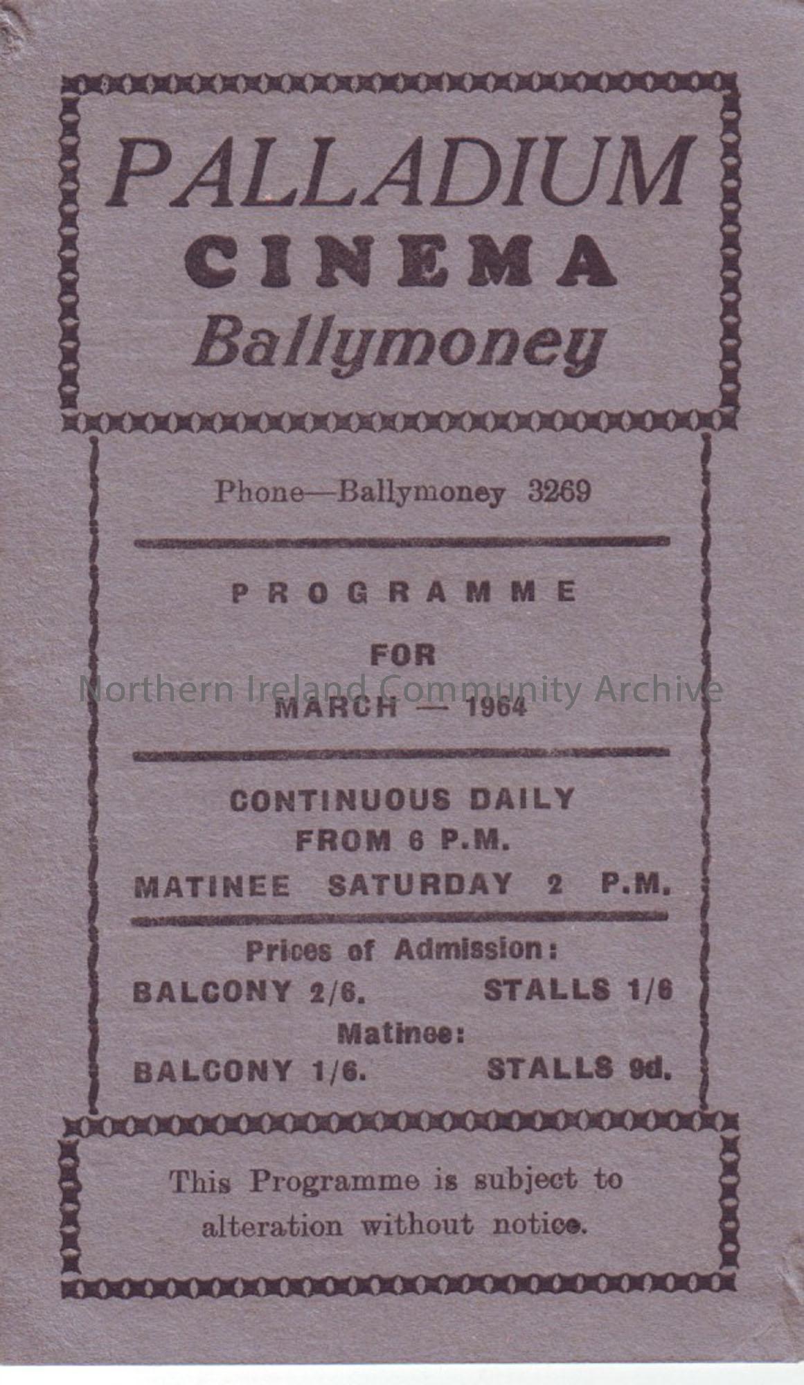 grey monthly programme for Ballymoney Palladium cinema- March 1964