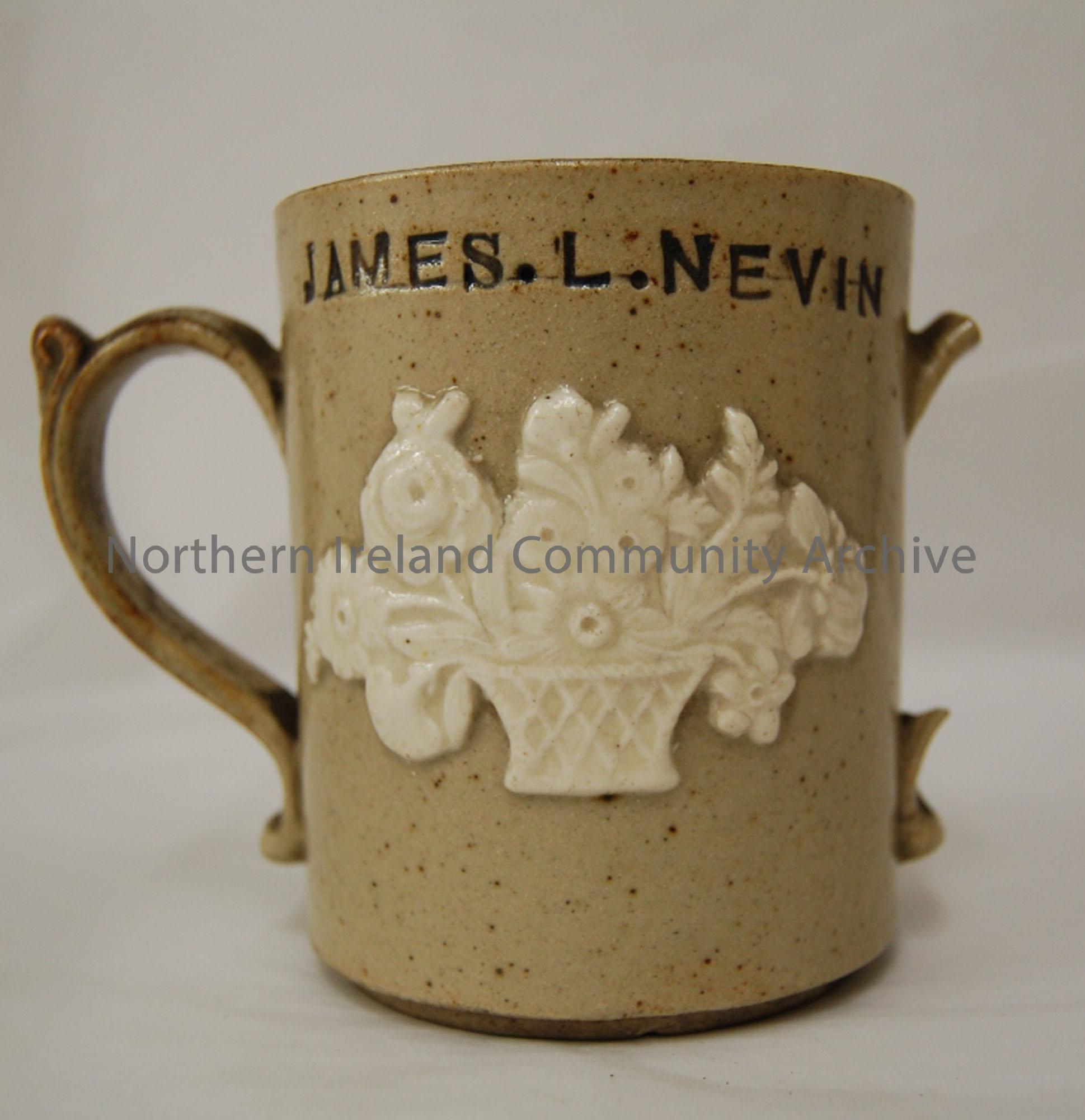 Grey two handled tankard (one now missing) embossed with white flower baskets.