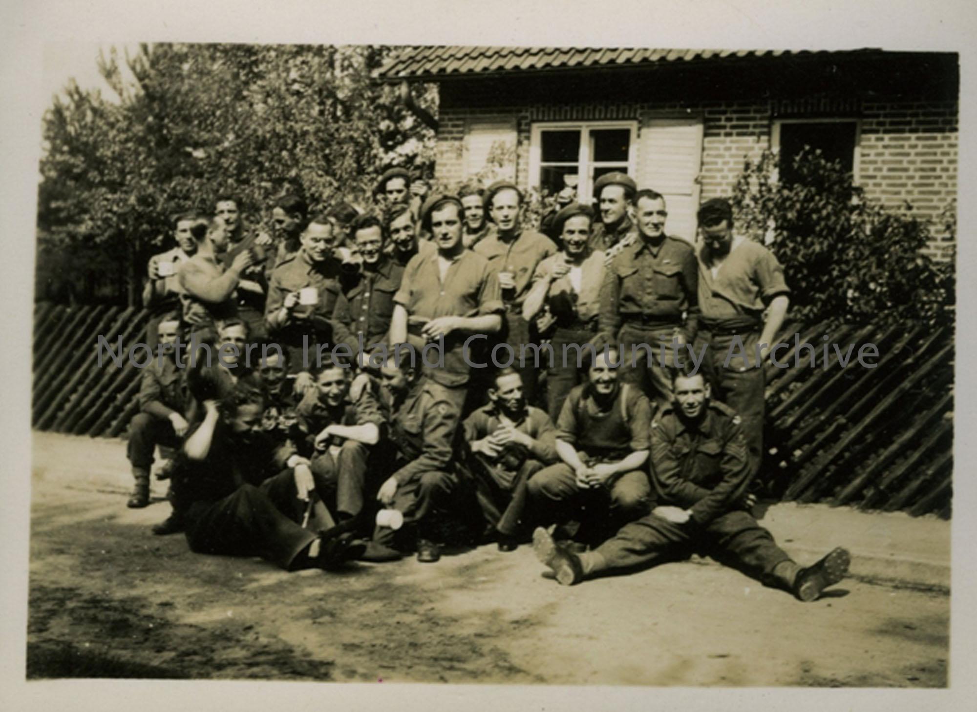 Group of 25 soldiers in Damme Germany. Includes: Sgt Elliot (Legs outstretched at right angles) S Nevin; A McGowan; A Thompson; W Norris; H Milford; A Elliot; R McVeigh; A Morrison.
