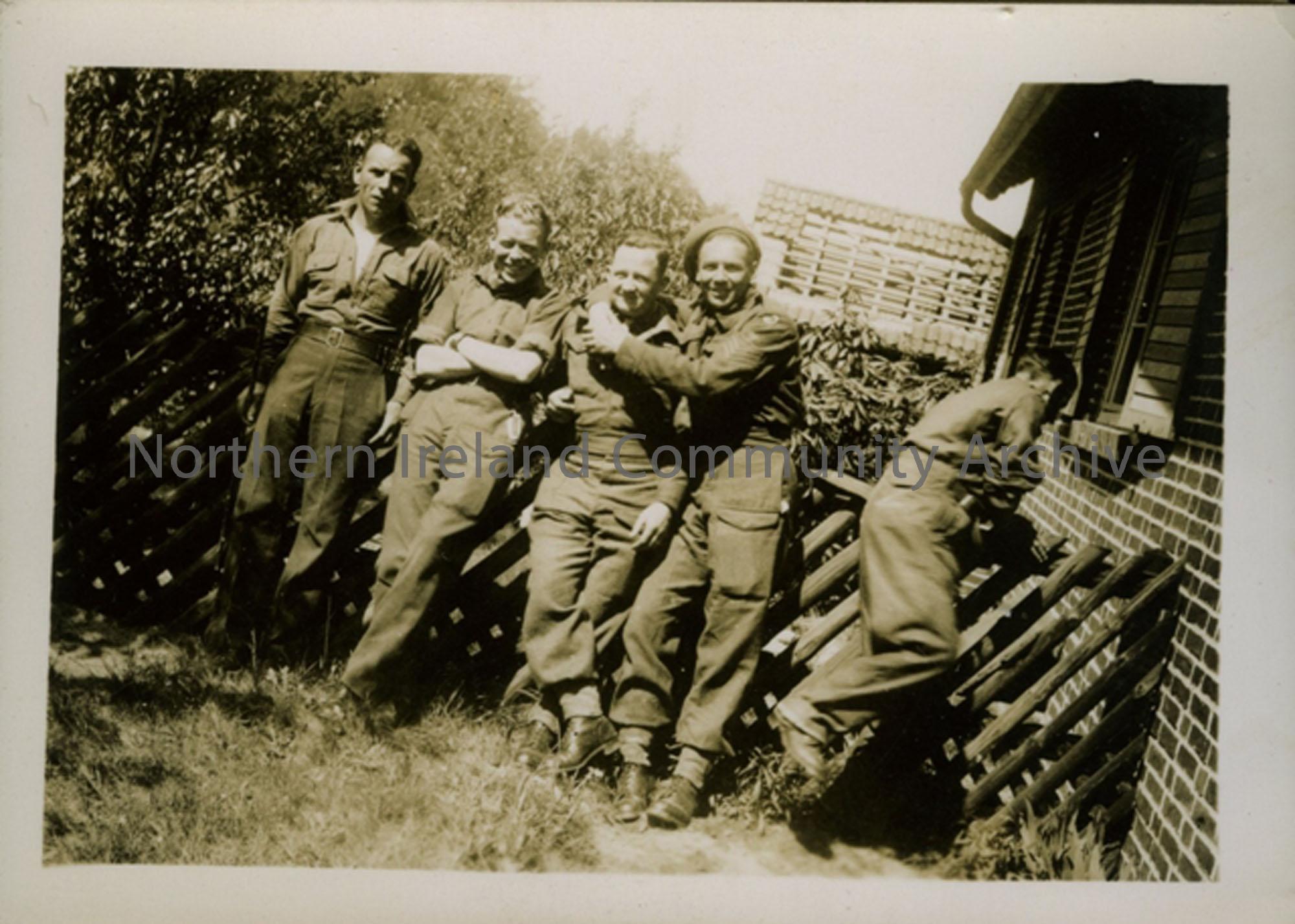 Group of 5 soldiers outside a house in Damme village Germany 1945. Willie Gamble; Alan Thompson; Frankie Walls; Alan Elliot; Bob McVeigh