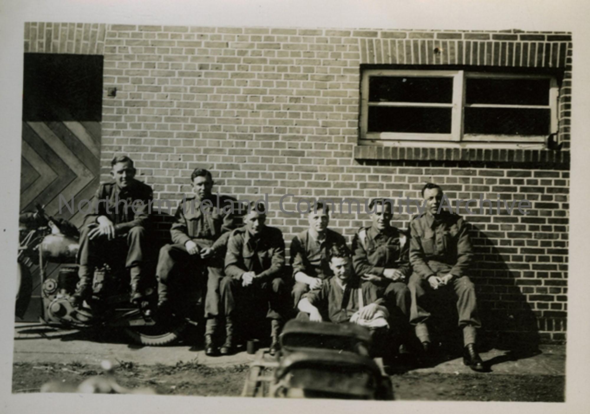 Group of 7 soldiers seated outside a brick building. R Graham; W Norris; J Johnston; J Jackson; J Henry; C Taylor; xxx.