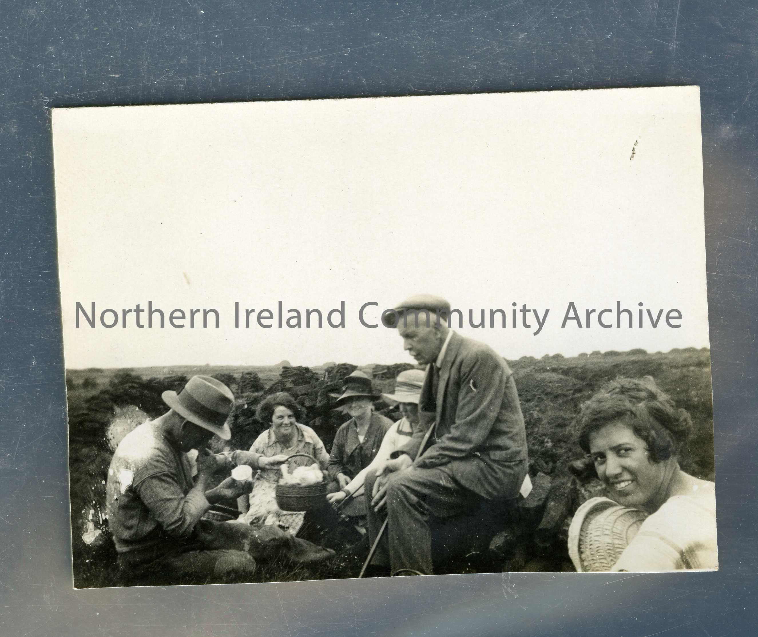 Group of adults having a picnic in a rural area.