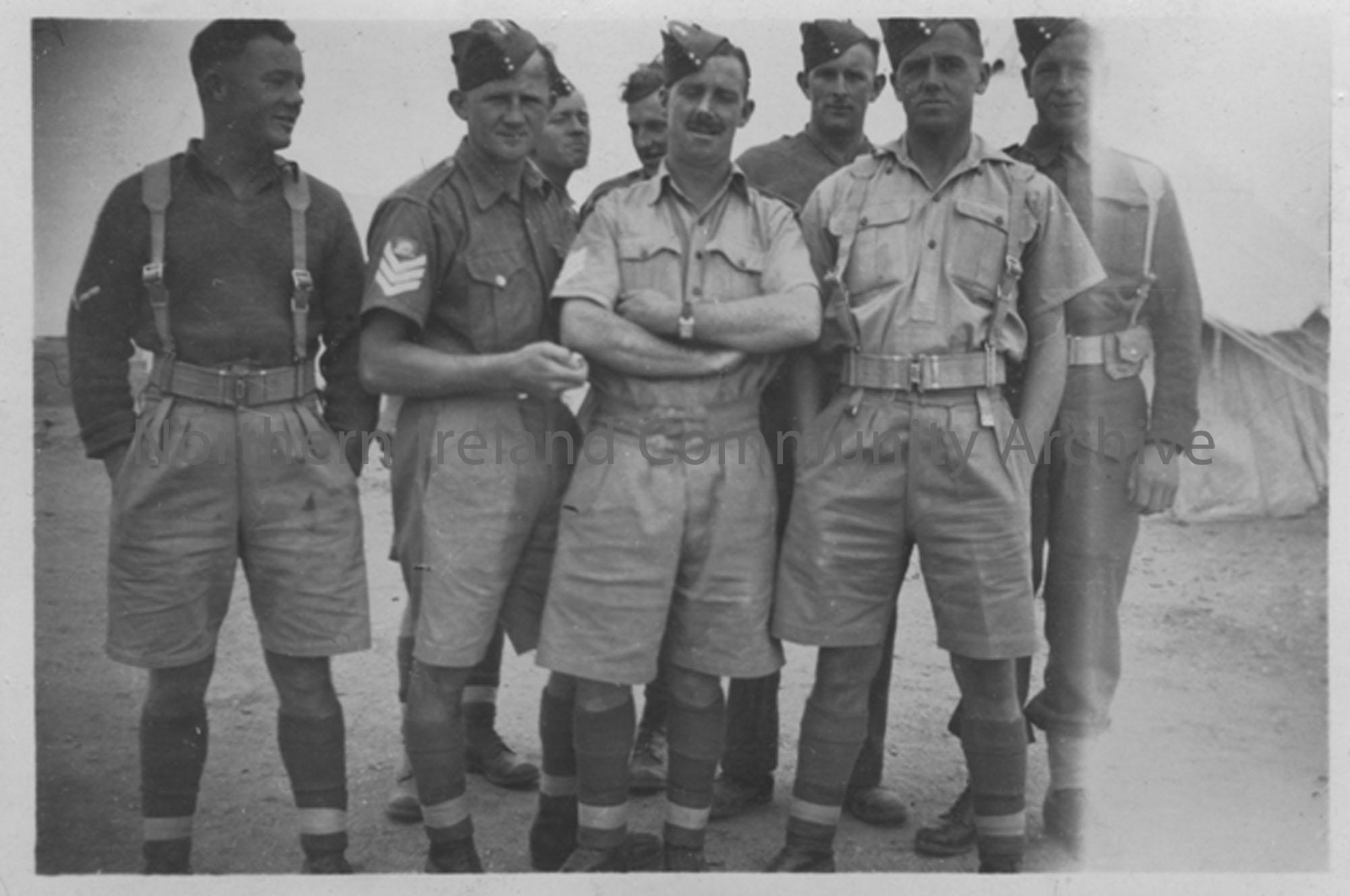 Group of Gunners in the desert. Bdr R McDonald; Sgt F Walls; xxx; J Robinson; C Connell; J Loughrey; Sgt W Oliver; J Haslam.
