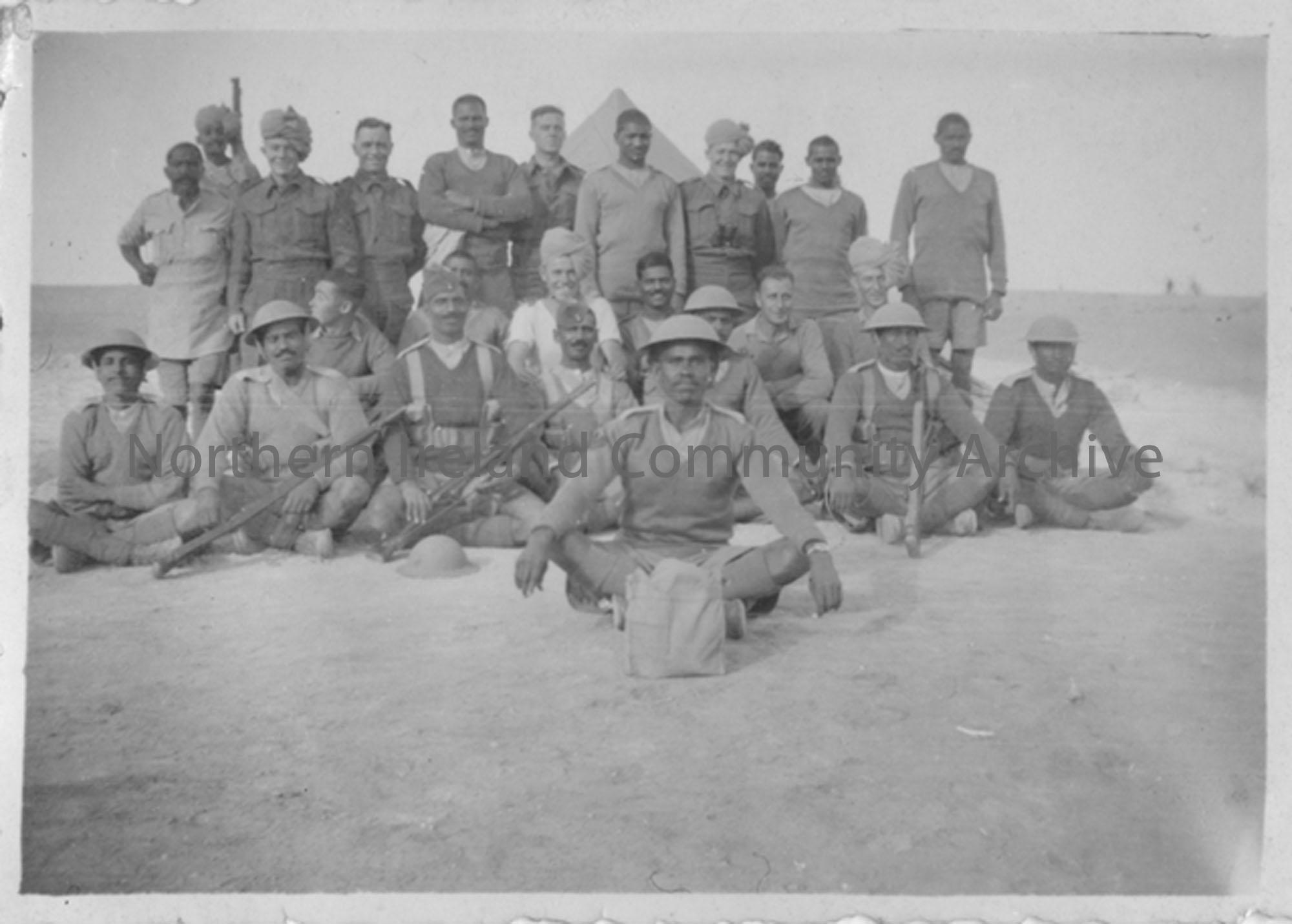 Group of gunners with Indian soldiers: Back row: xx; xx; R McDonald; xx; xx; W Oliver; xx; xx; xx; xx; xx. Middle row right Gunner is J Hamilton