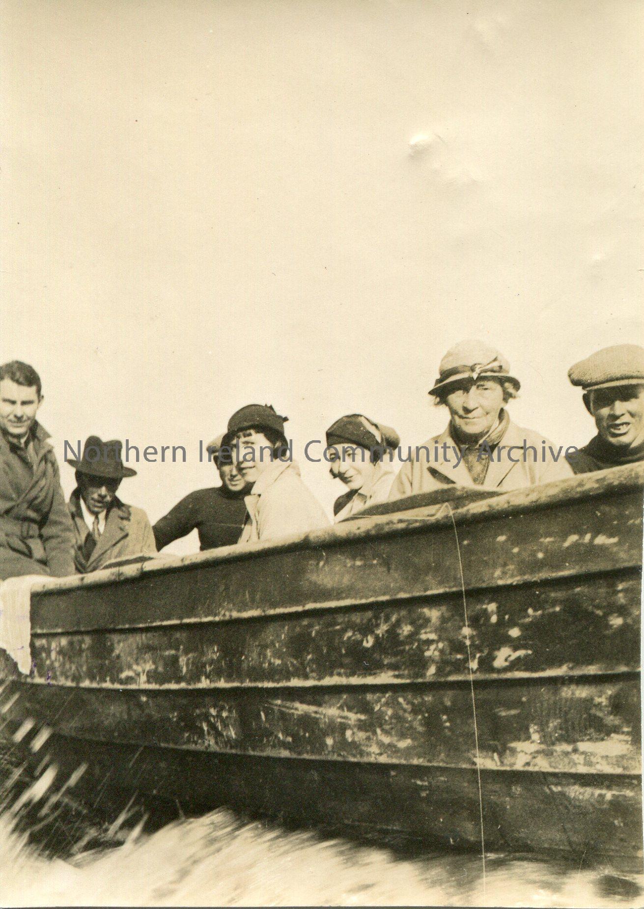 Group of men and women in a wooden boat.