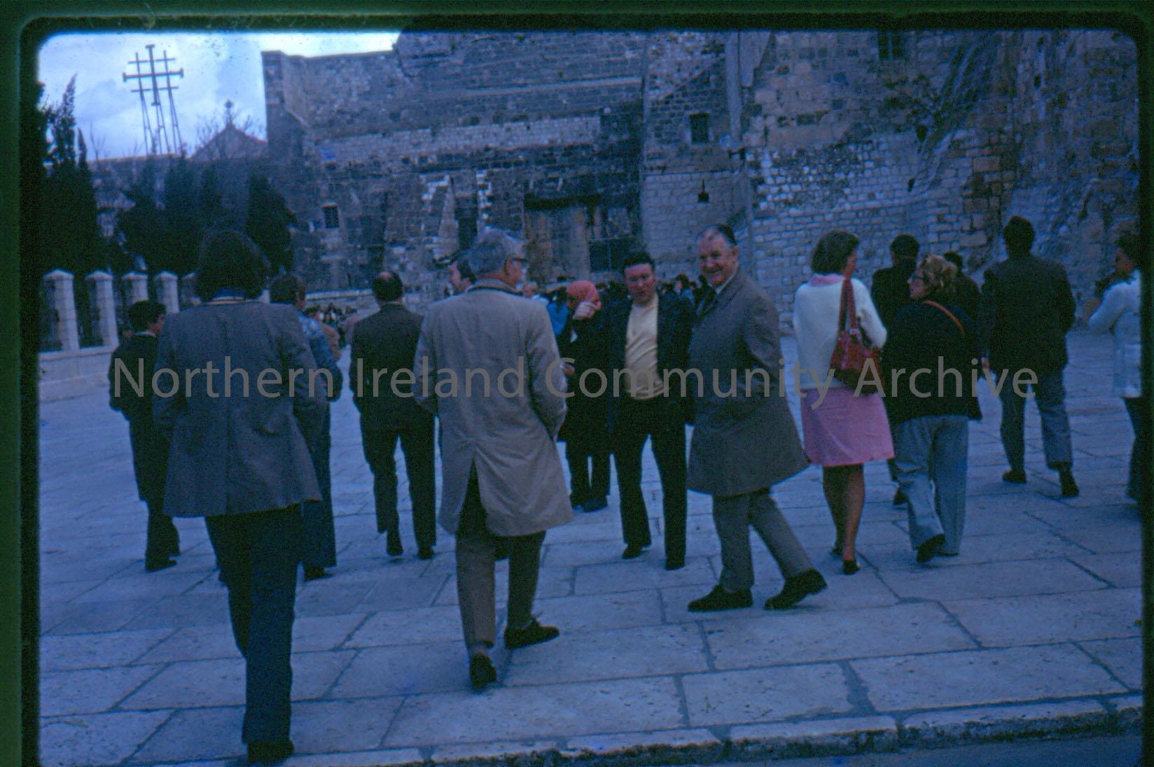 slide depitcing group of men at ruins. Slide numbered 2 and dated March 1976