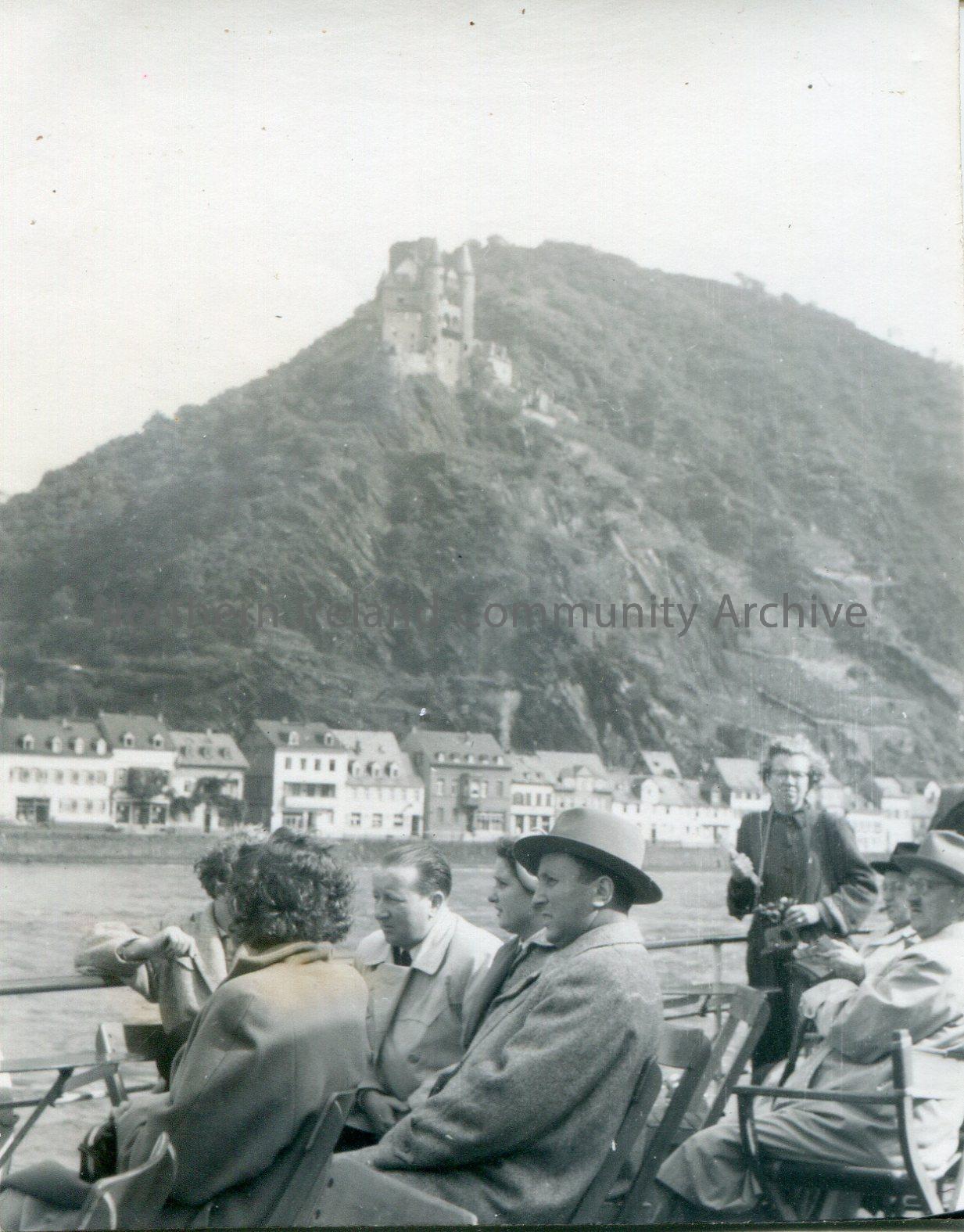 Group of people on a boat with buildings in the background and a castle on a hill. Captioned, ‘Castle along Rhine’.