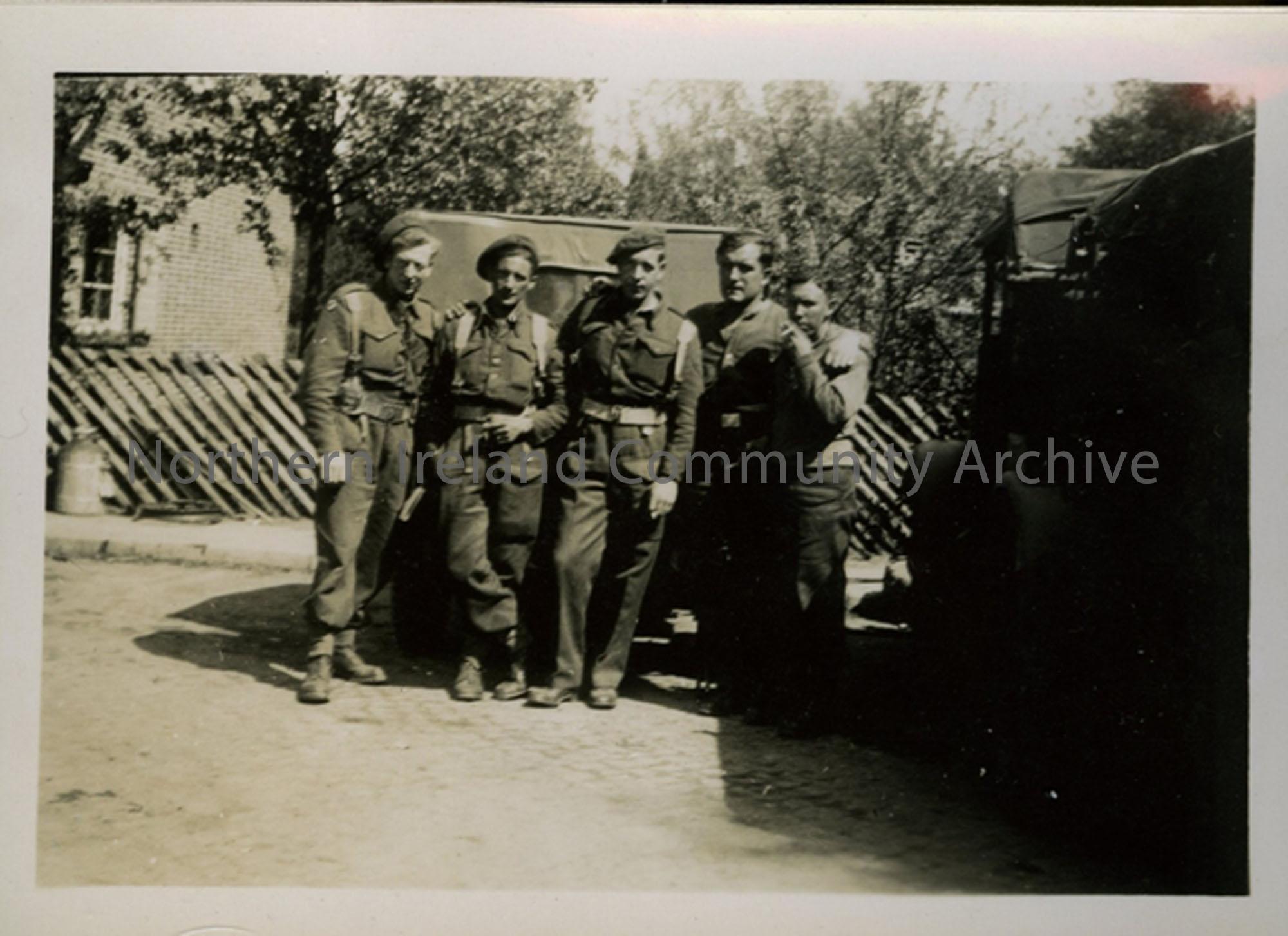 Group of 5 soldiers outside in Damme Village Germany. W Heward; xxx; J Haslam; H Milford; W Norris.