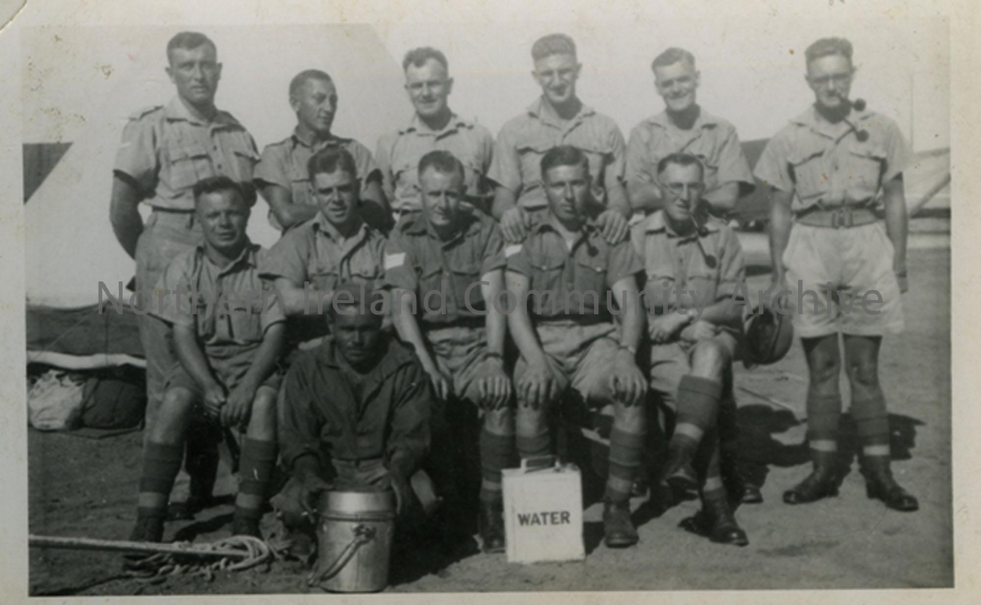 Group of soldiers, white case labelled "water" in front of them. H Milford; J Leighton; R McDonald; xxx; xxx; J Fletcher; W Campbell; S Lake; J Hunter; J Hamill; C Burke.