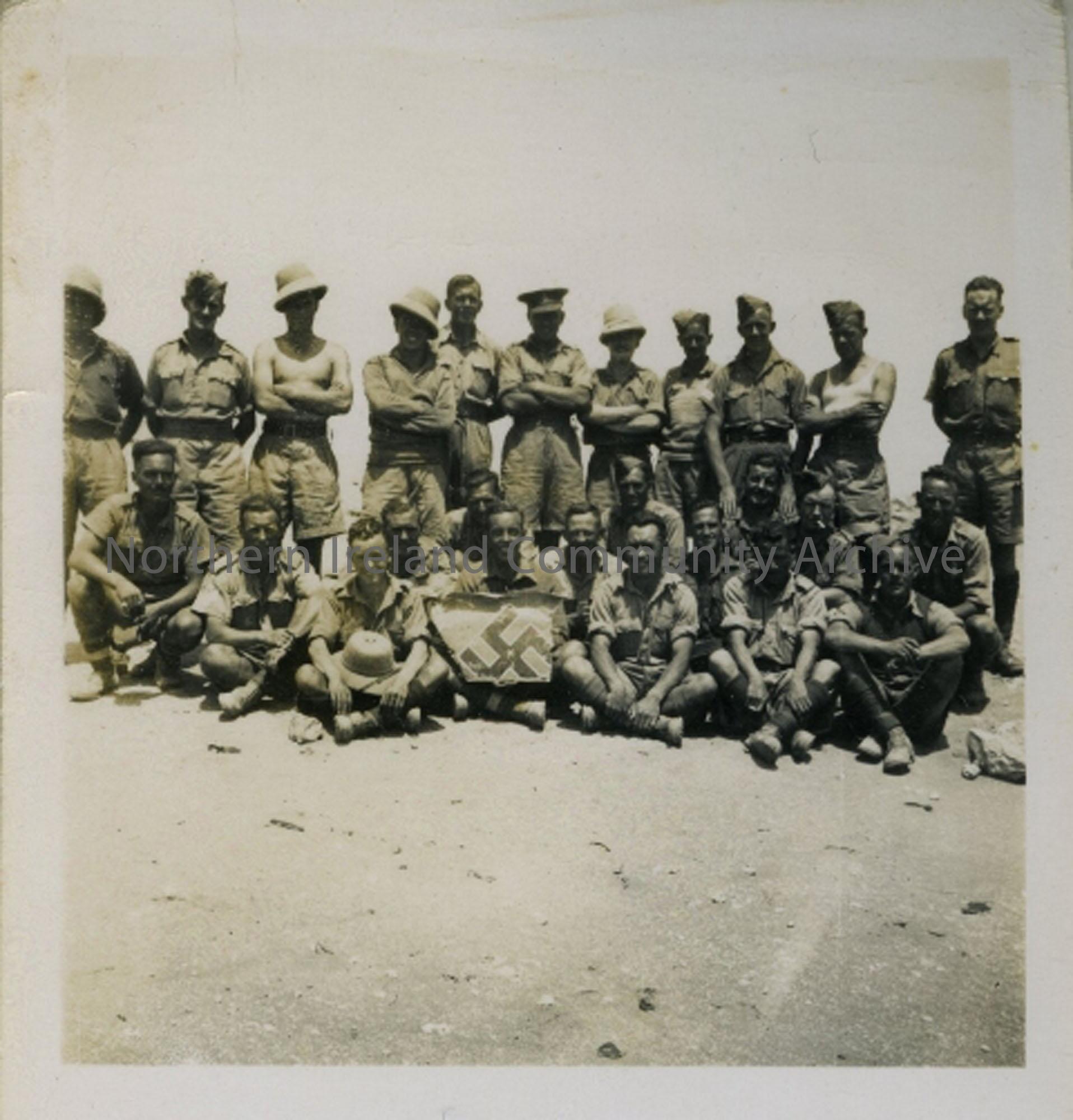 Group of soldiers in a desert setting. Charlie Taylor is holding a scrap bit of metal with the swastika symbol on it.