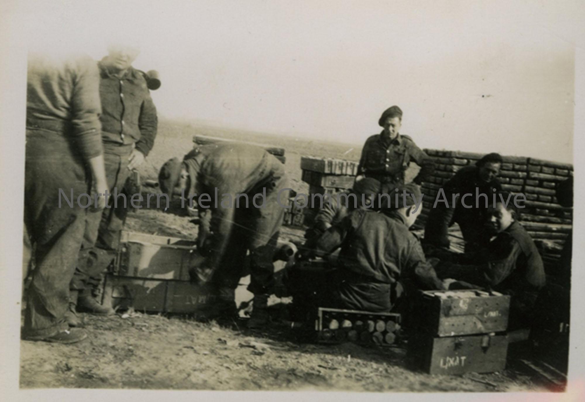 Group of soldiers with ammo boxes. W Heward standing to the right in the background.